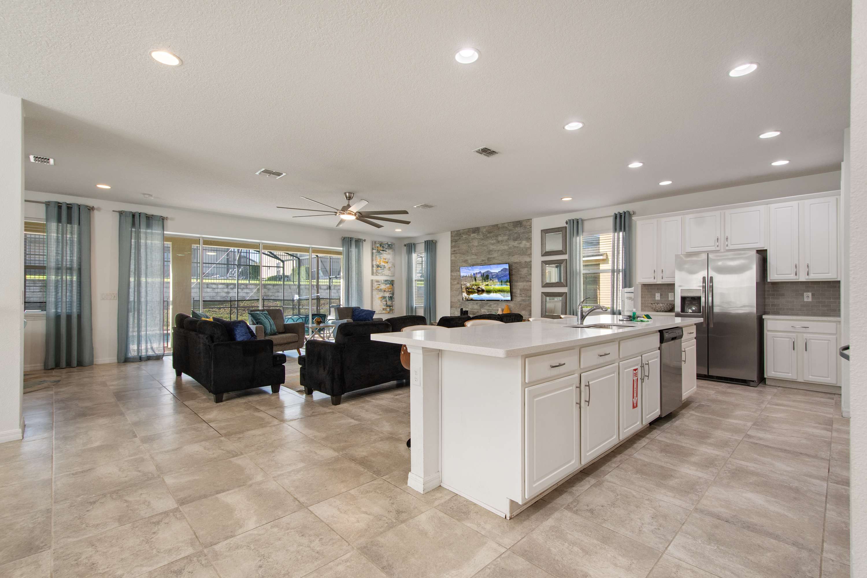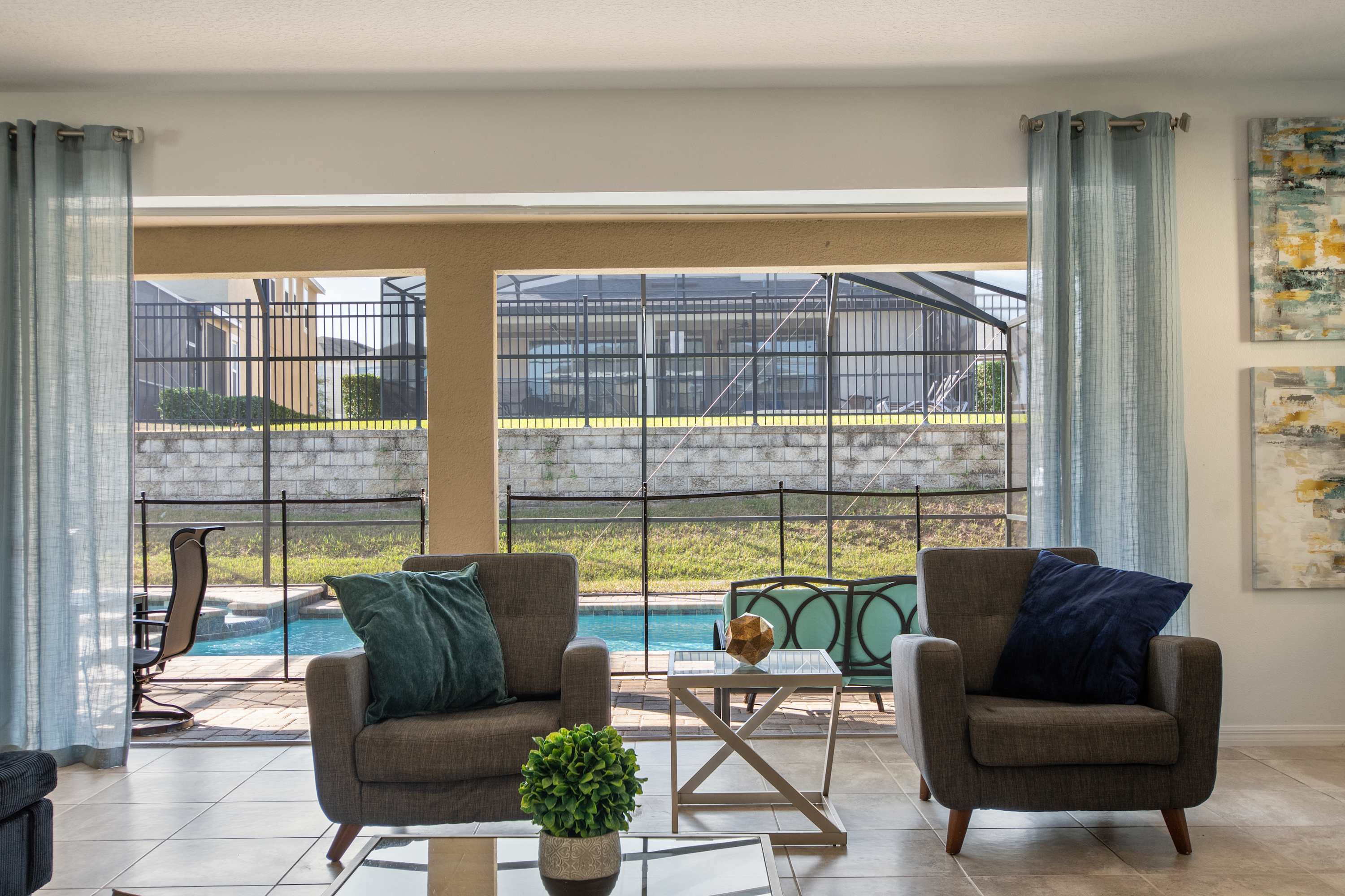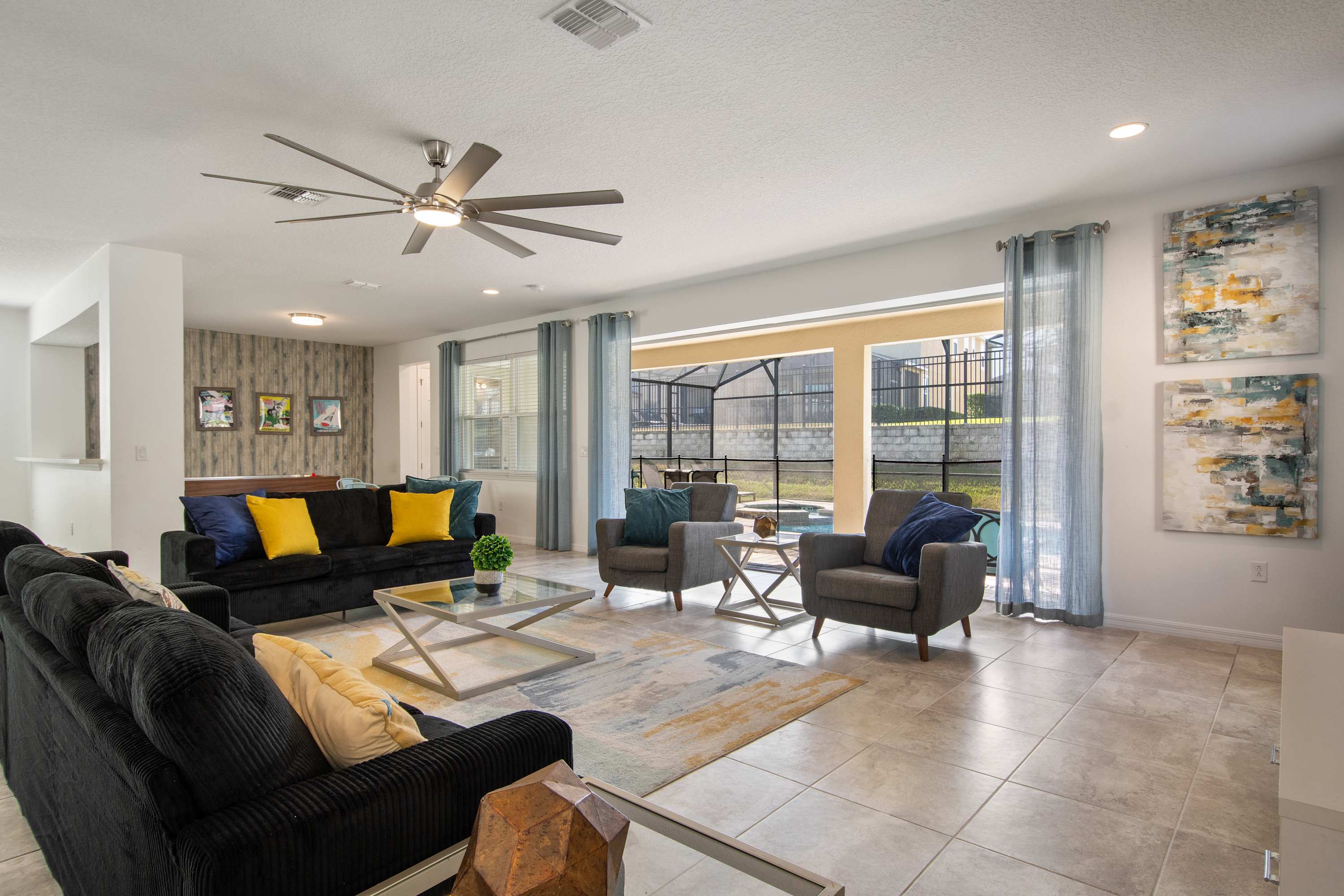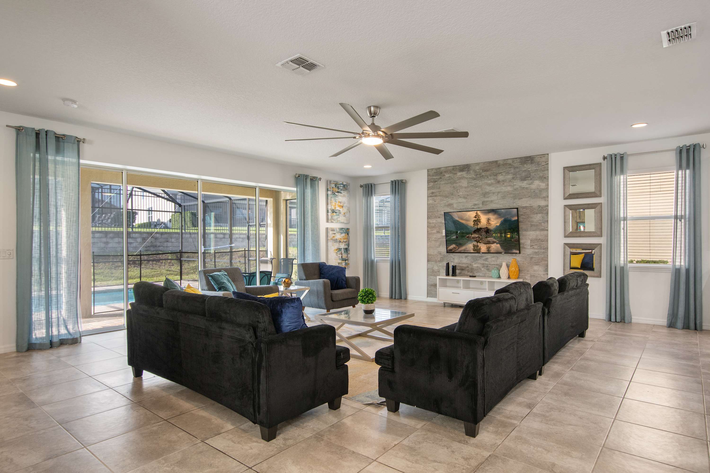 - Large sectional sofa, accent chairs, bright windows, pool access, Smart TV.