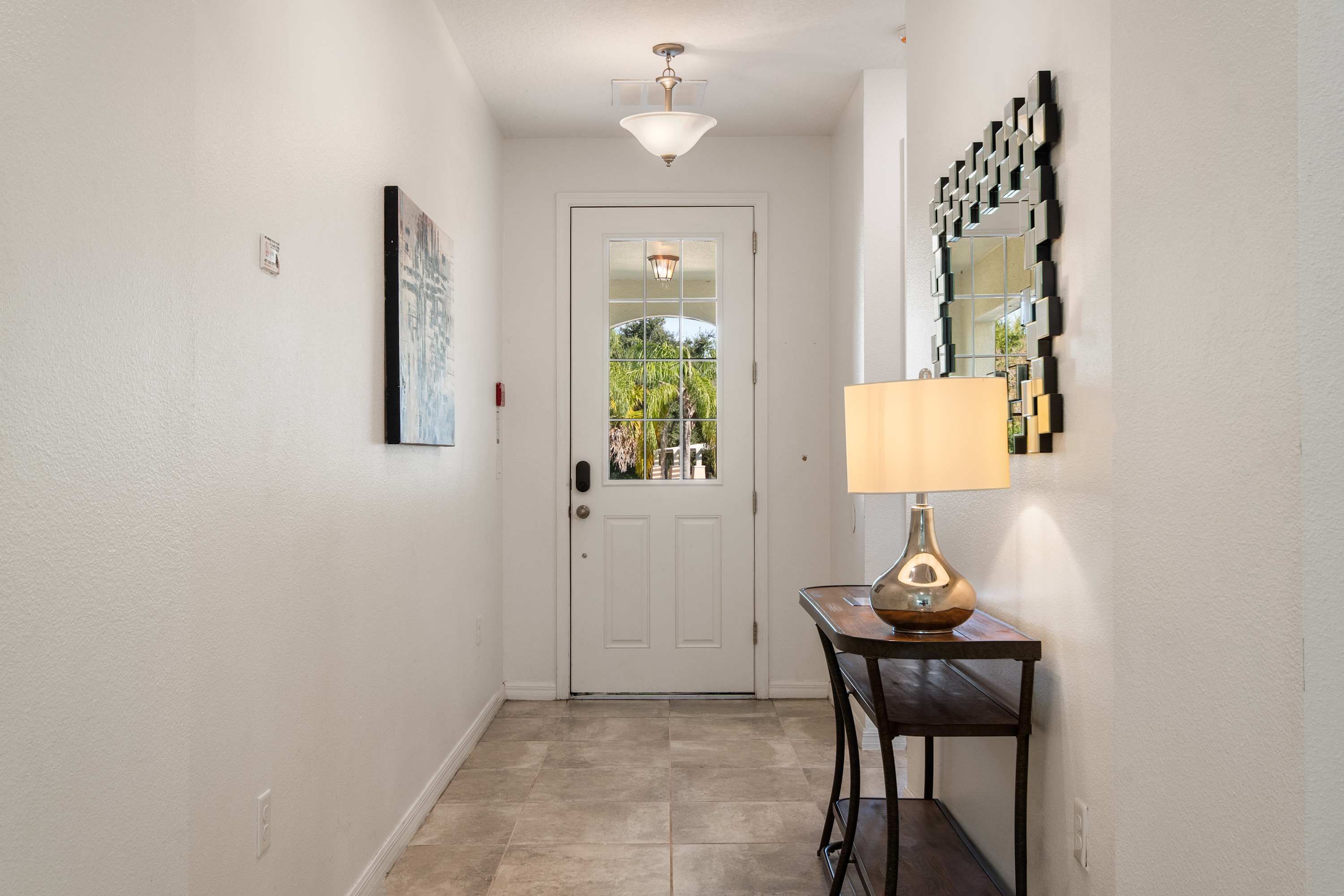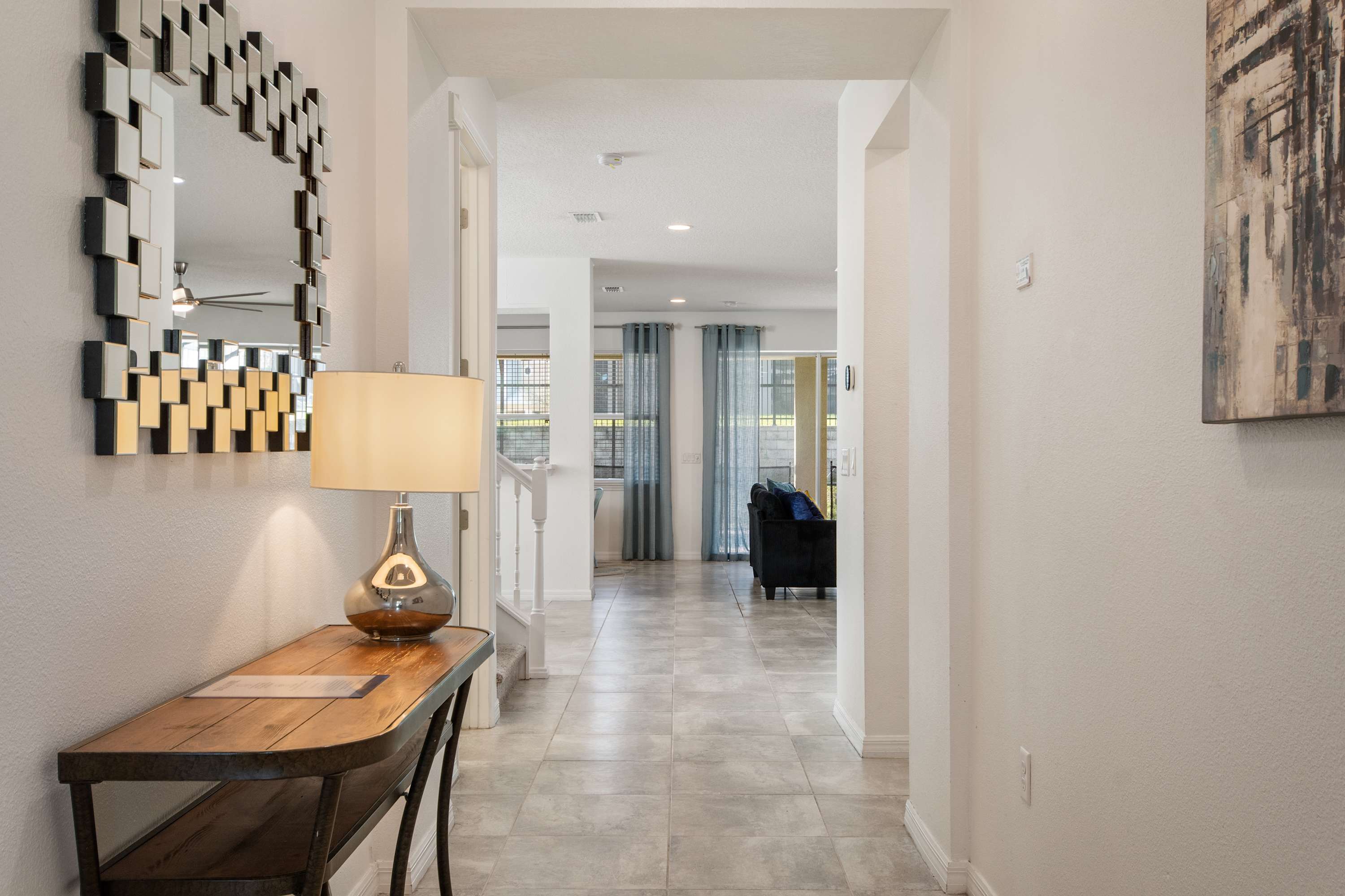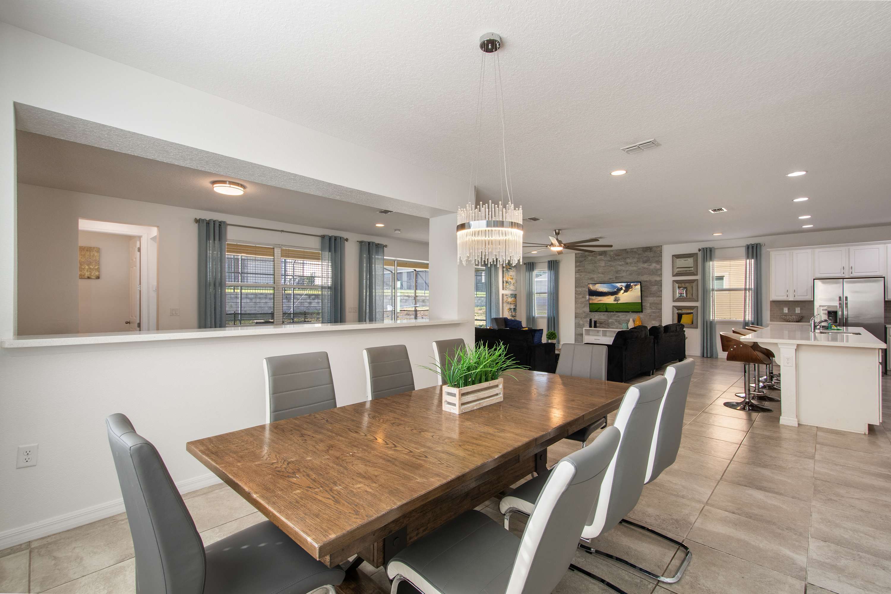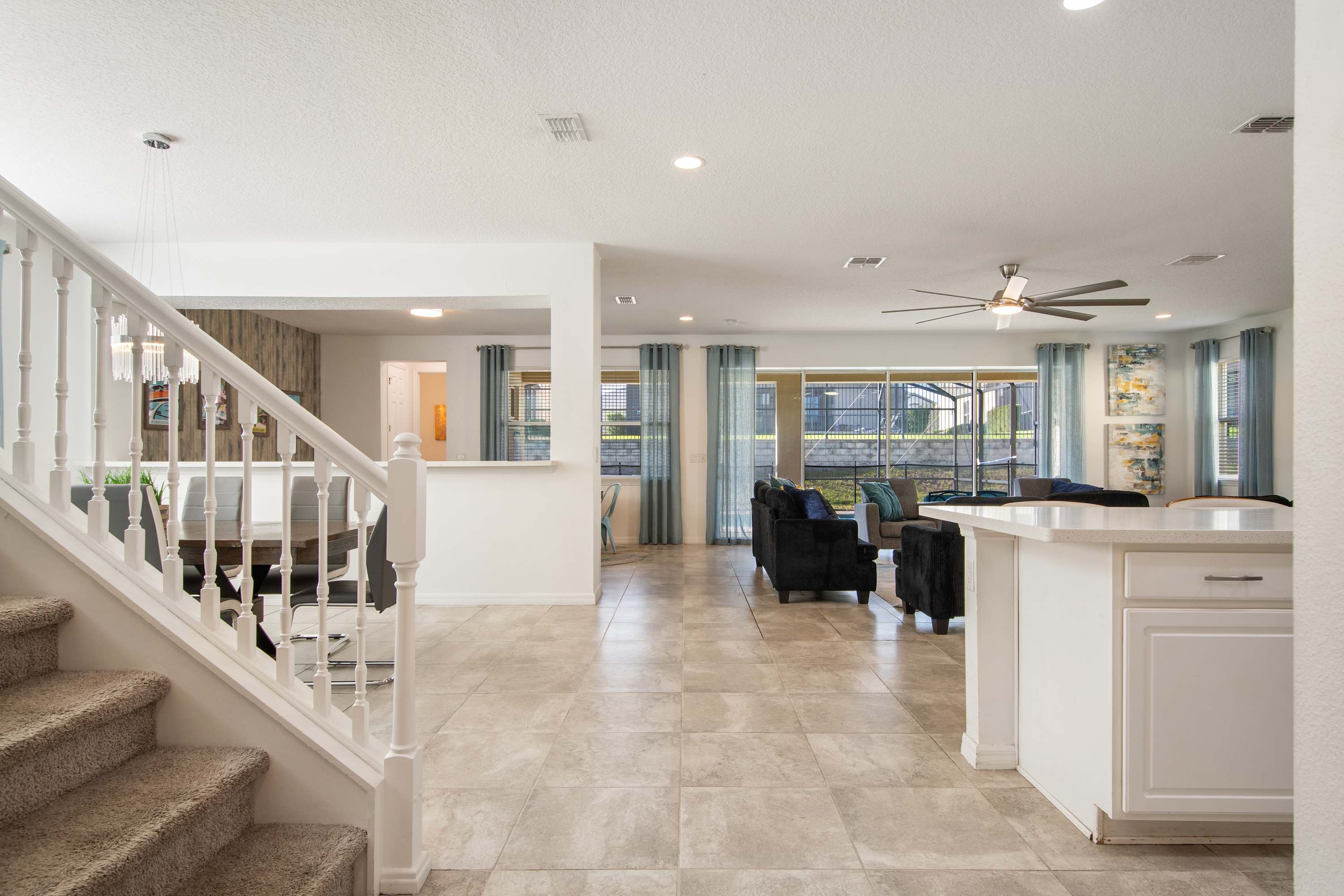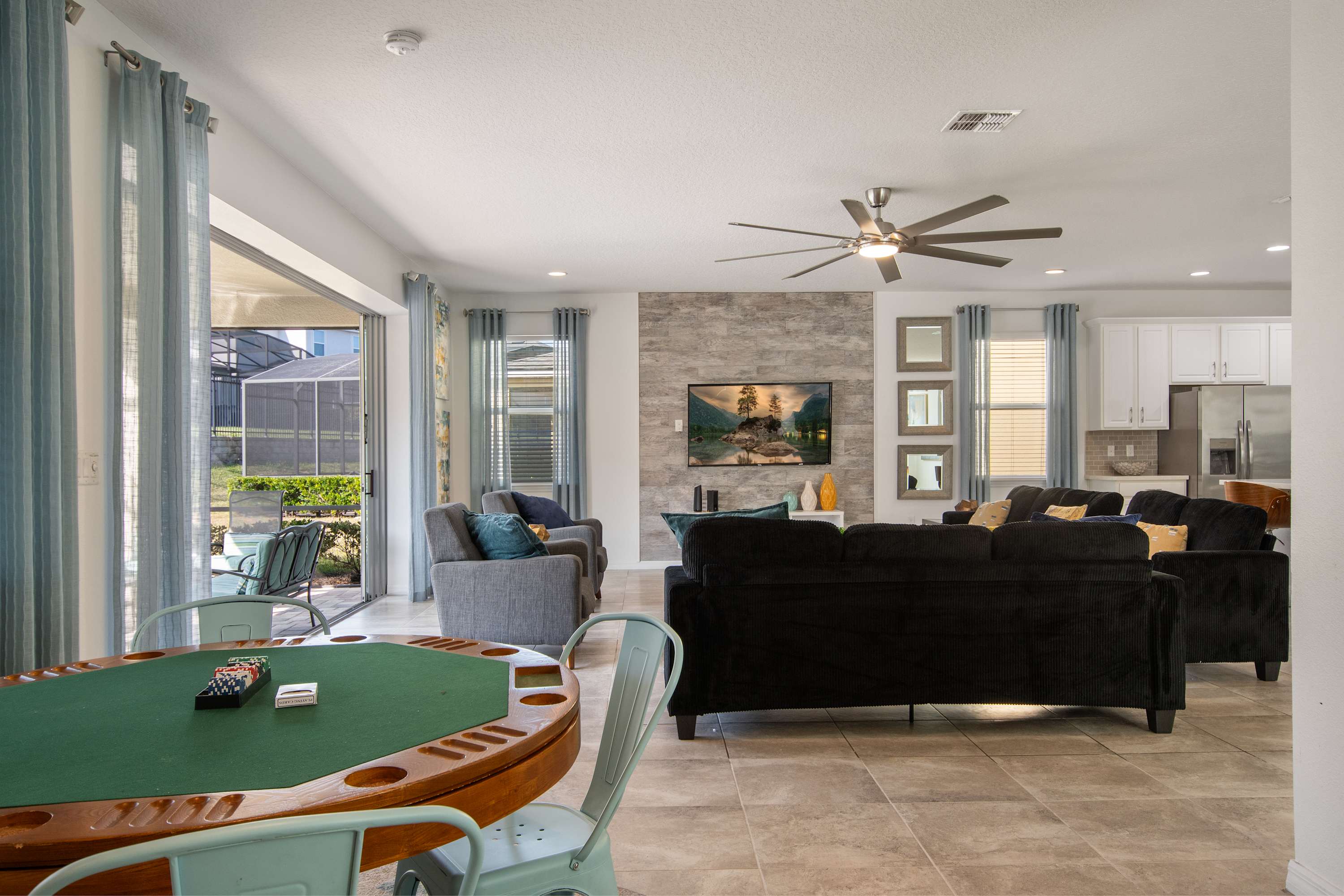- Large sectional sofa, accent chairs, bright windows, pool access, Smart TV.