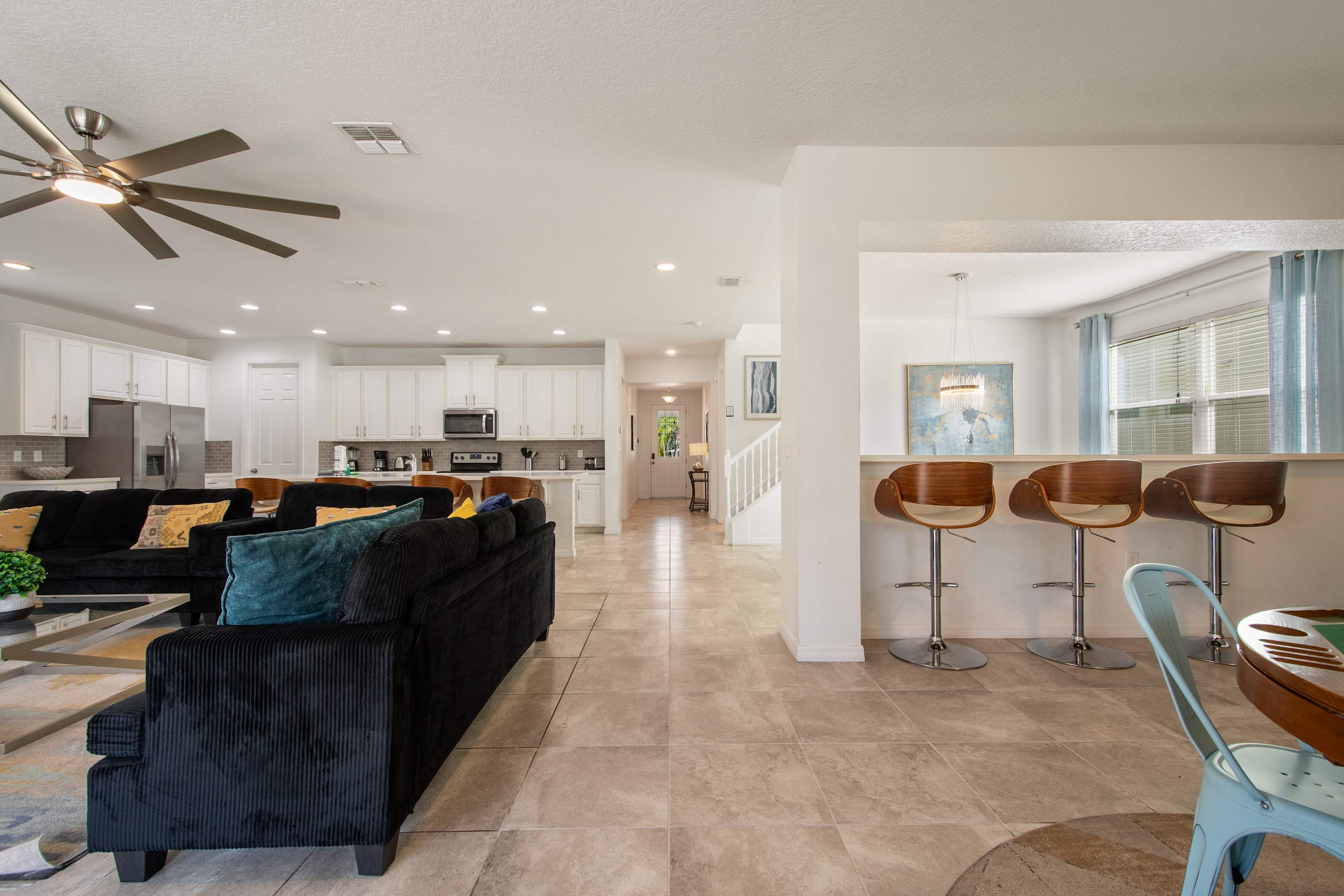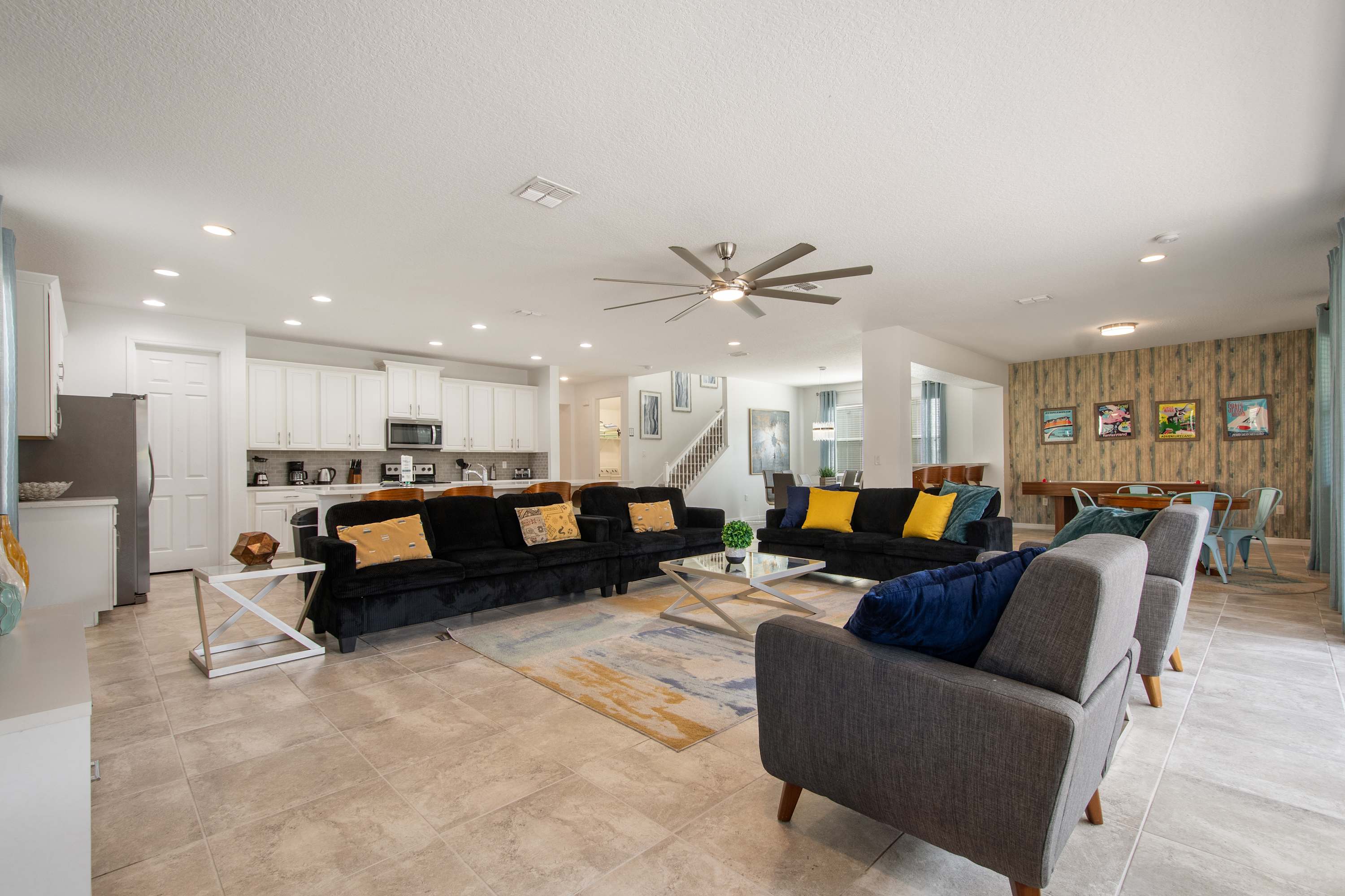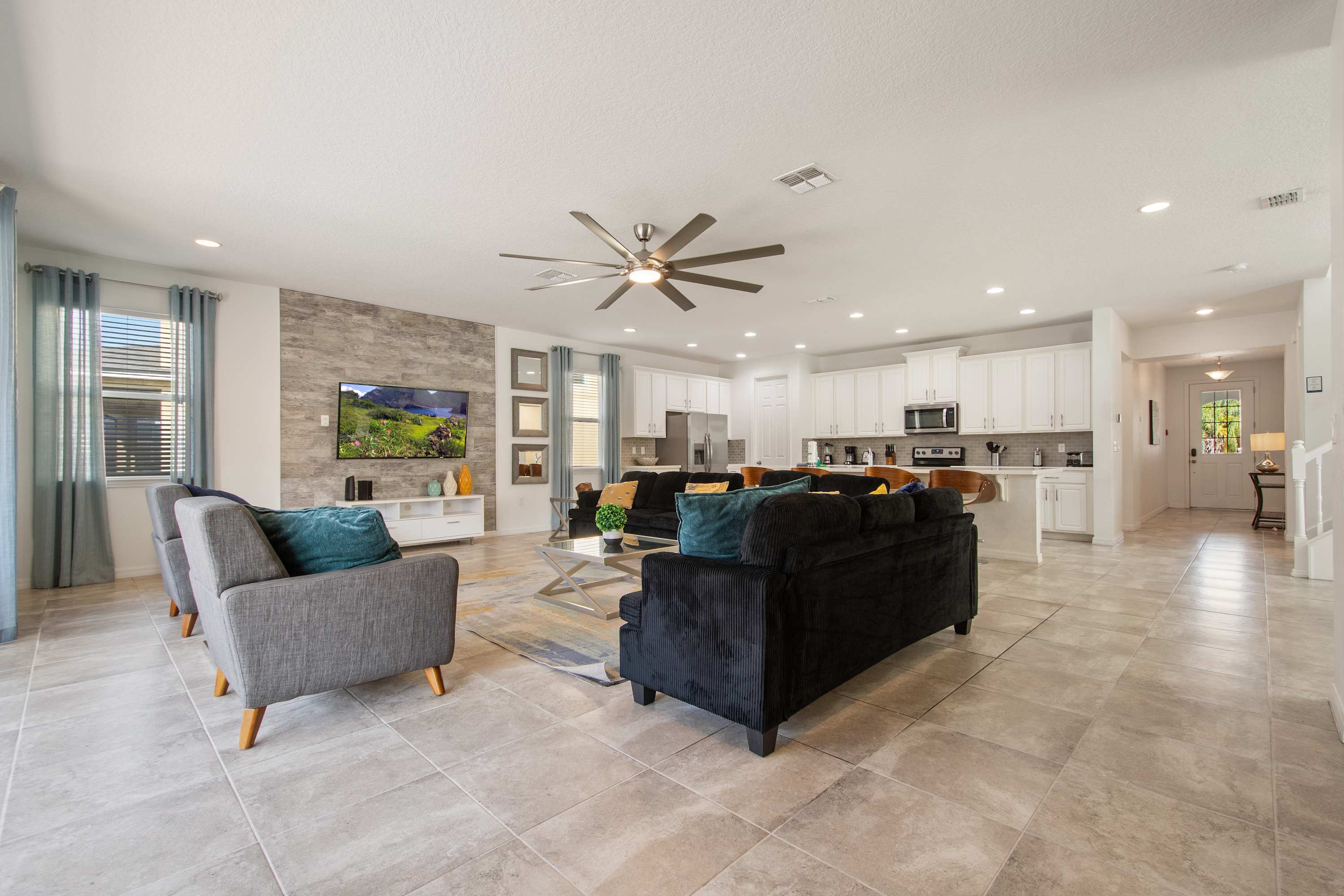 - Spacious open-concept living room with large sectional + Smart TV