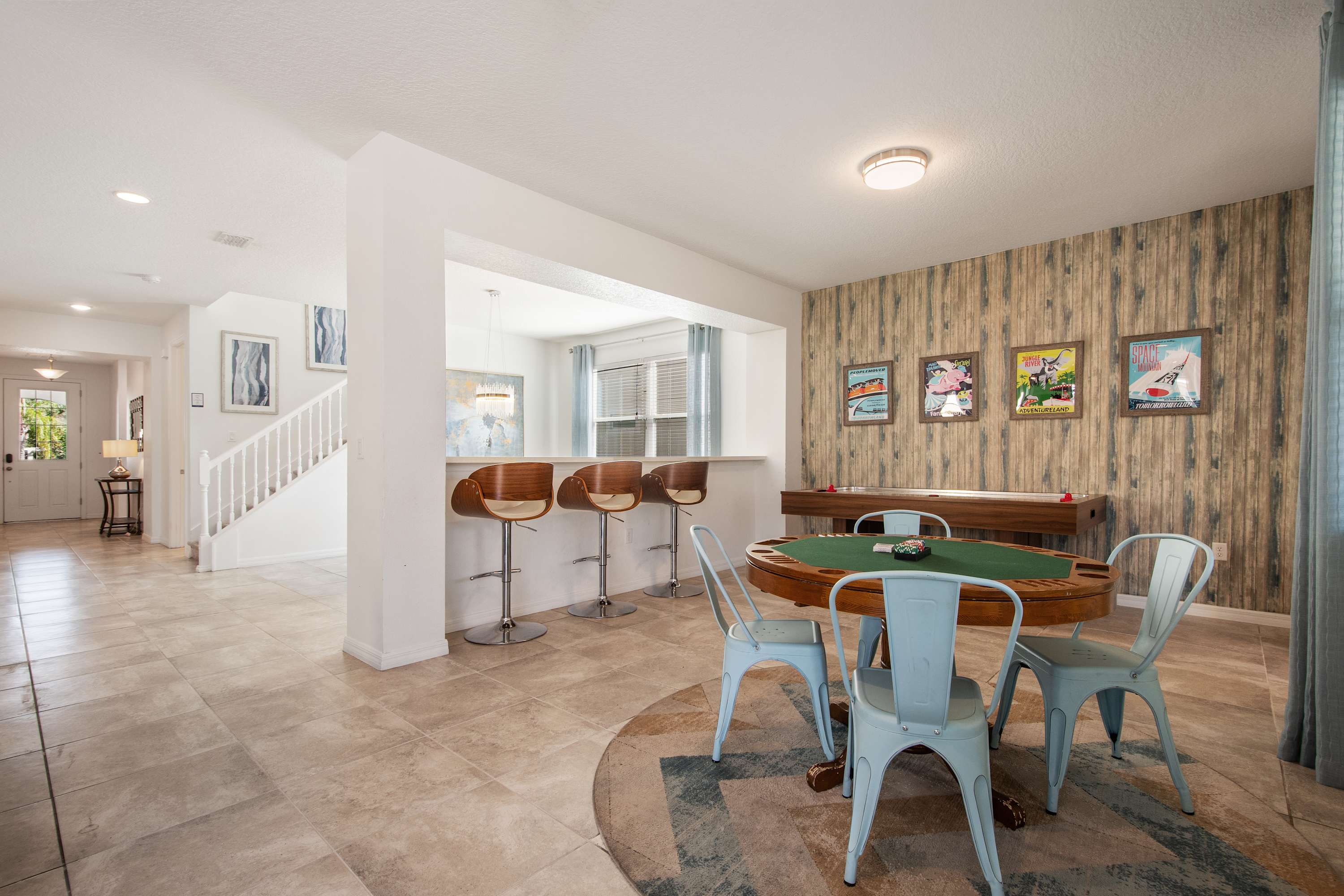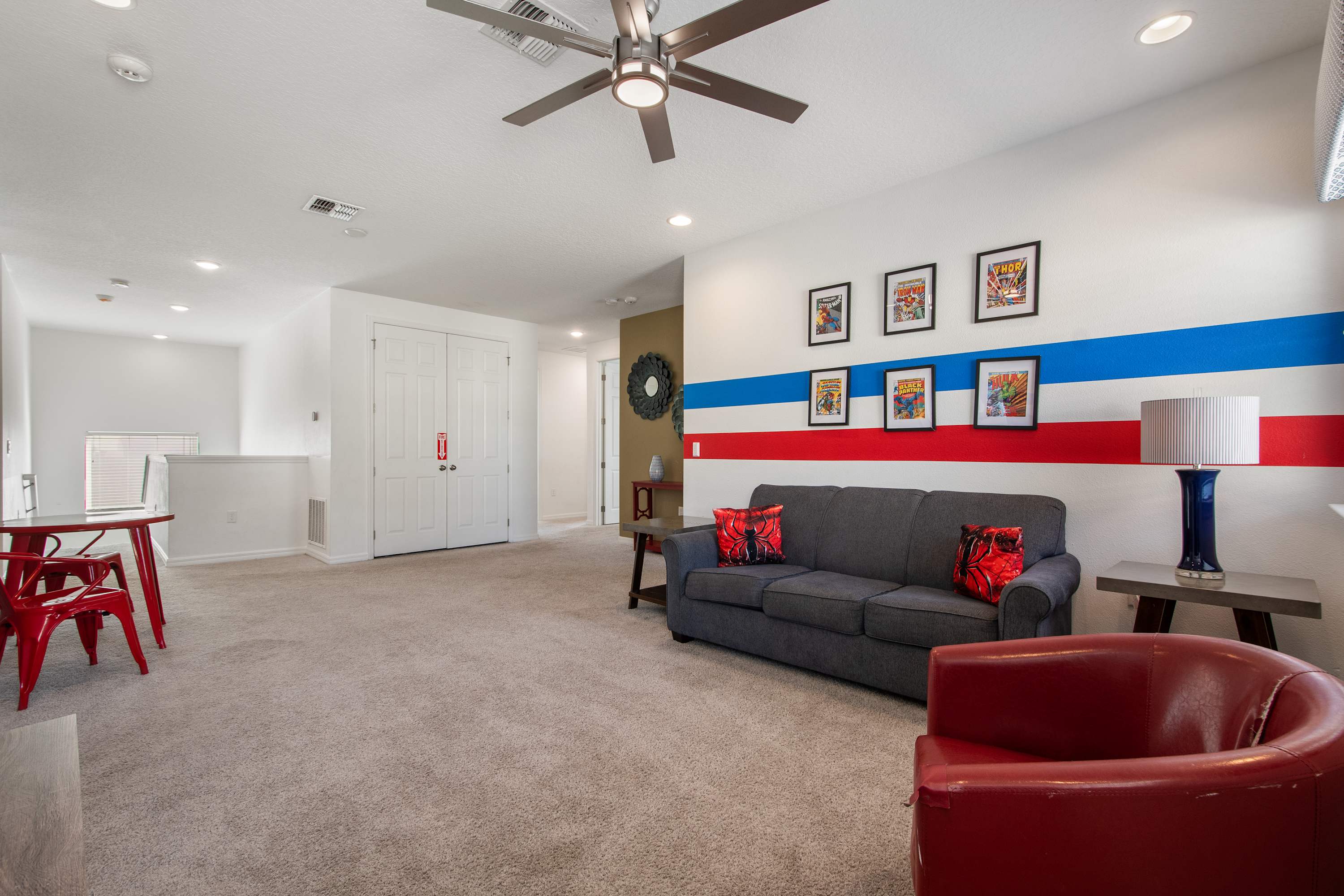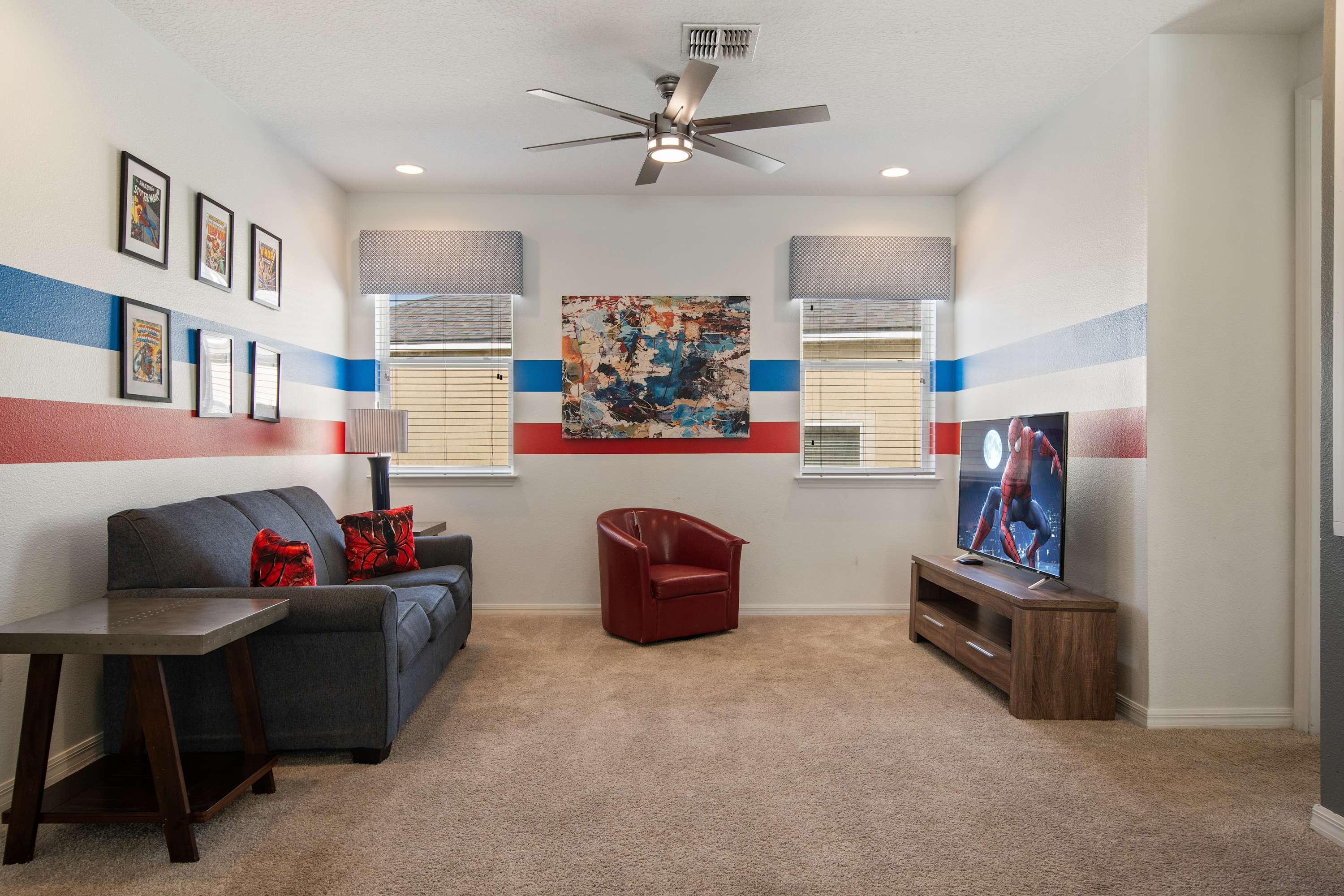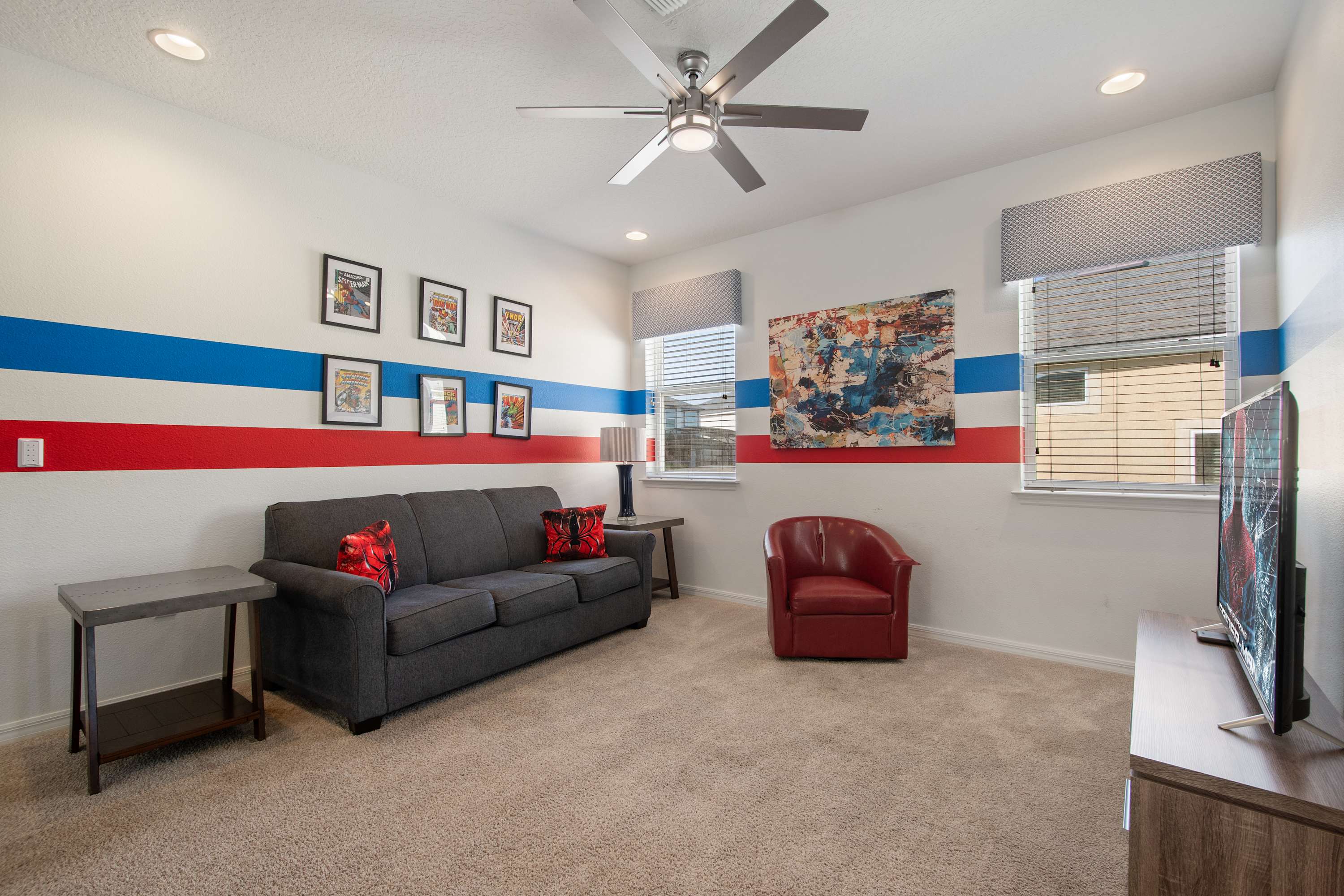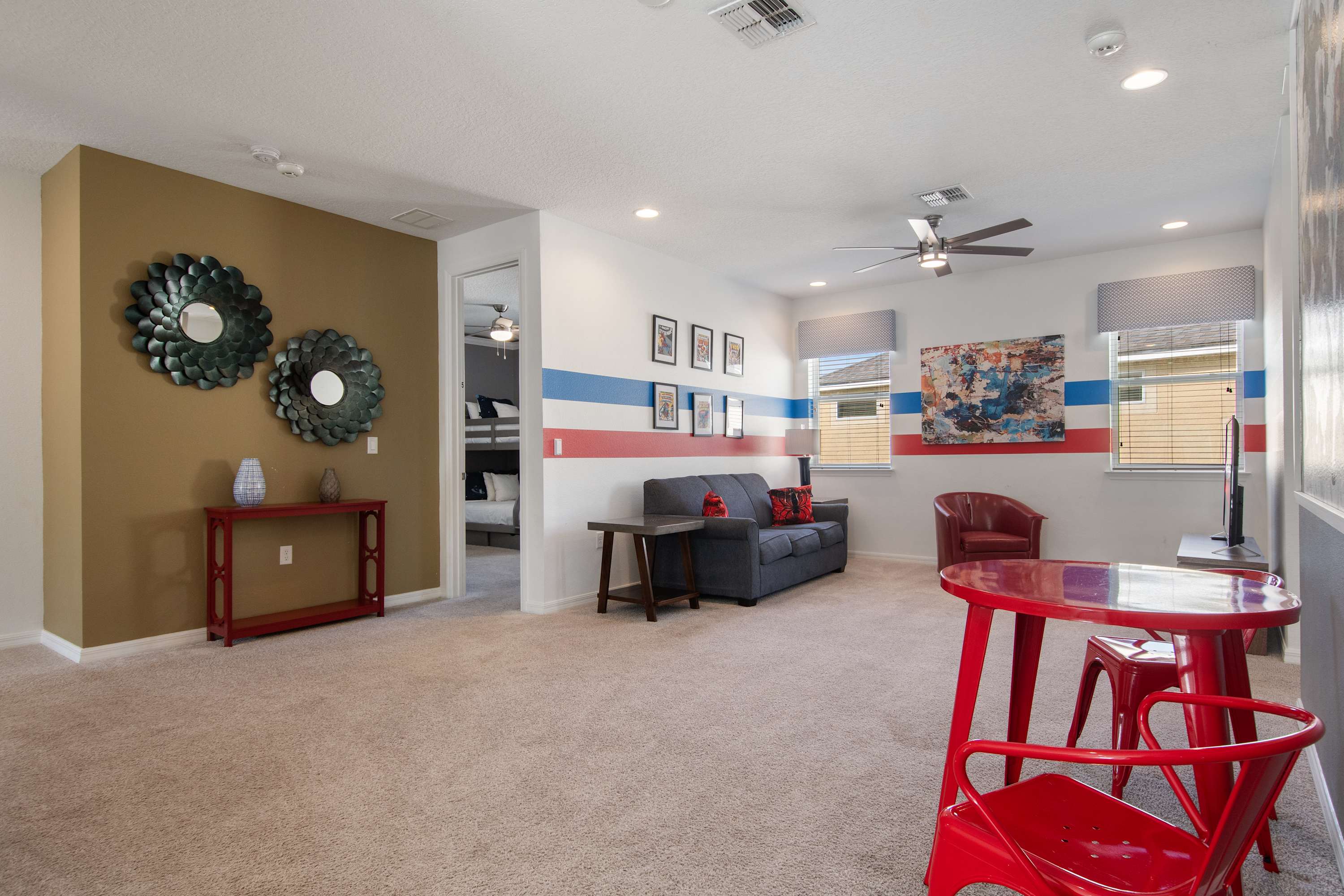 - Upstairs game loft with gaming setup + lounge seating