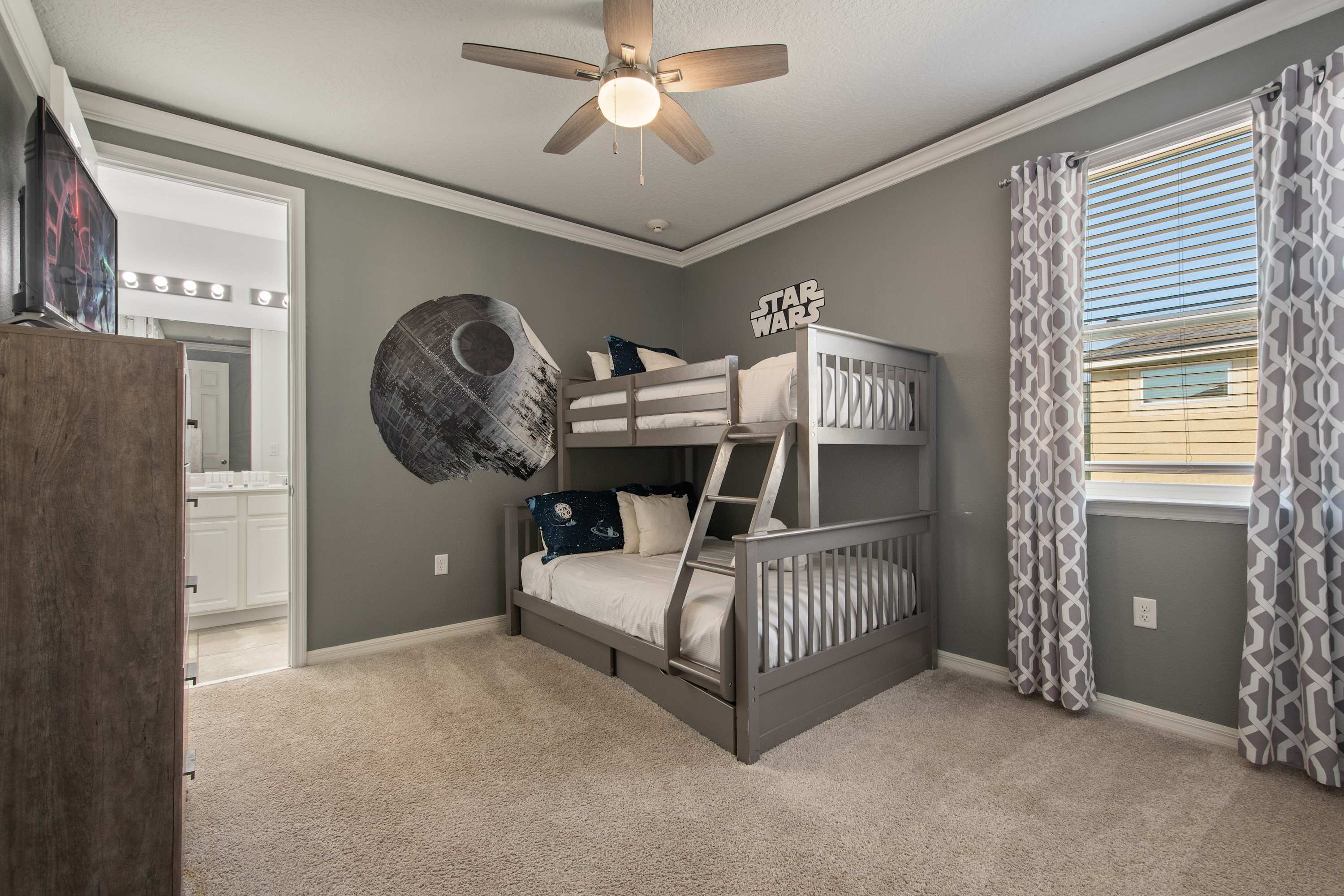 Twin-over-full bunk bed with Death Star mural and Galactic décor.