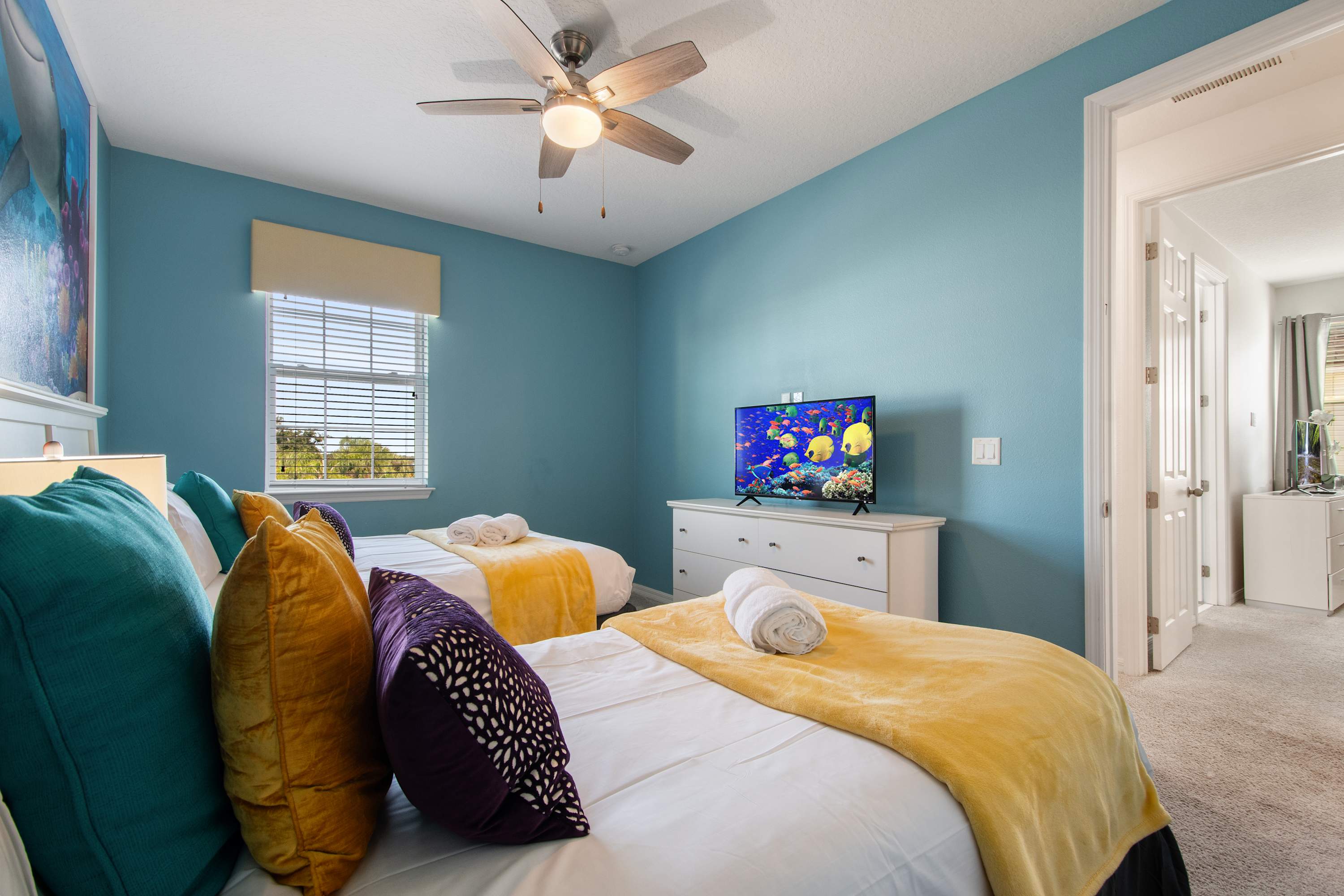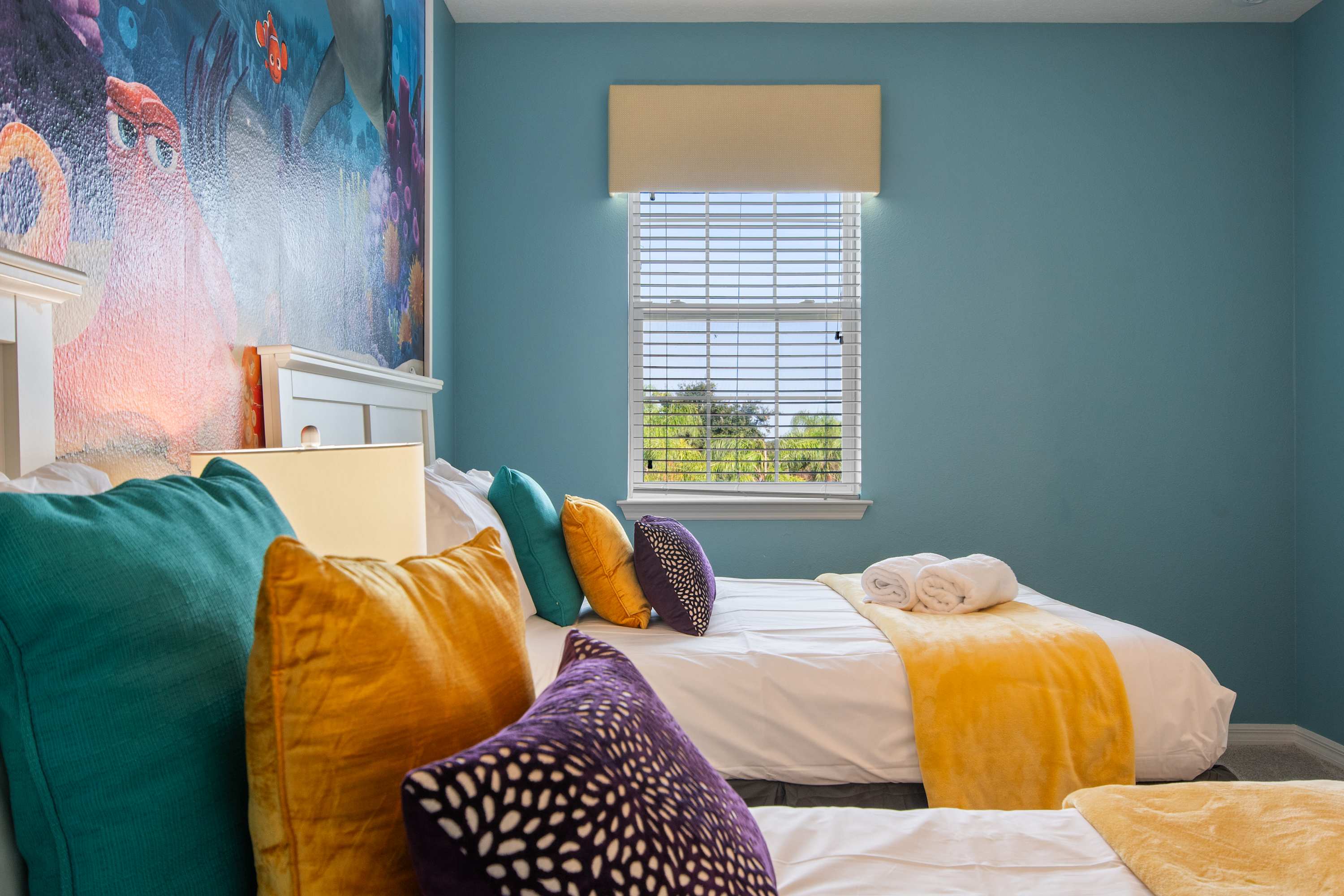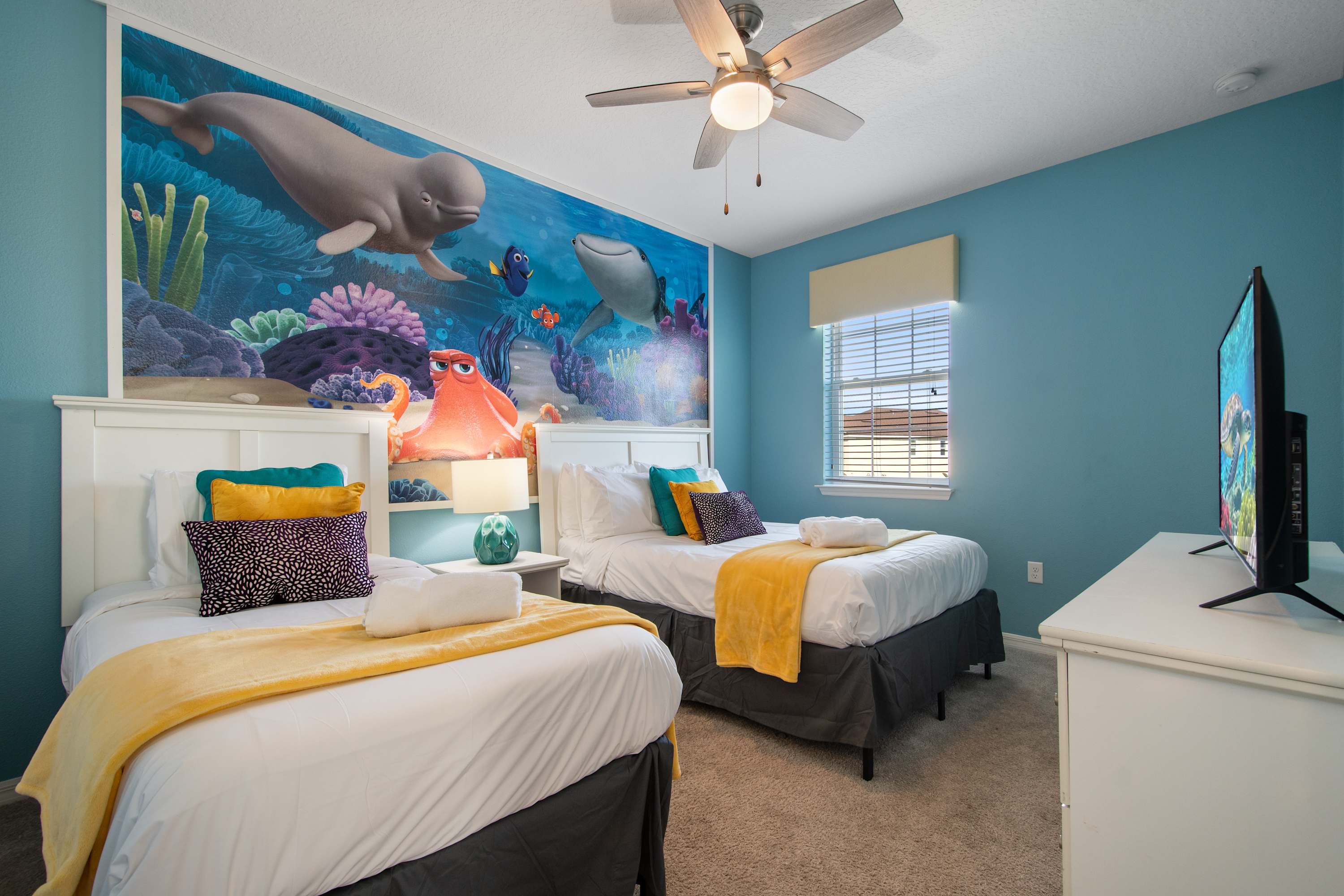 Twin + Full beds with bright aquatic wall mural (Nemo-style).