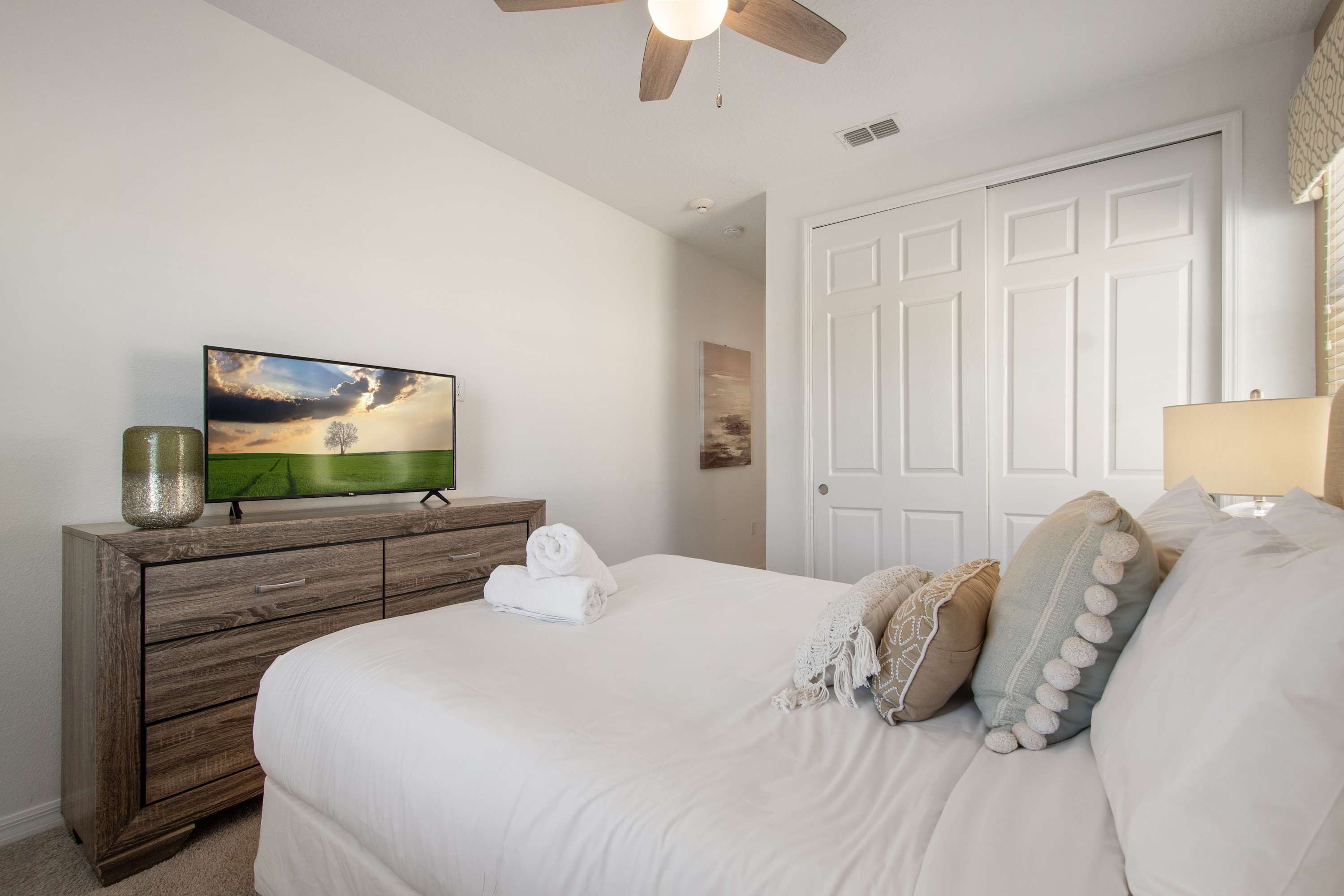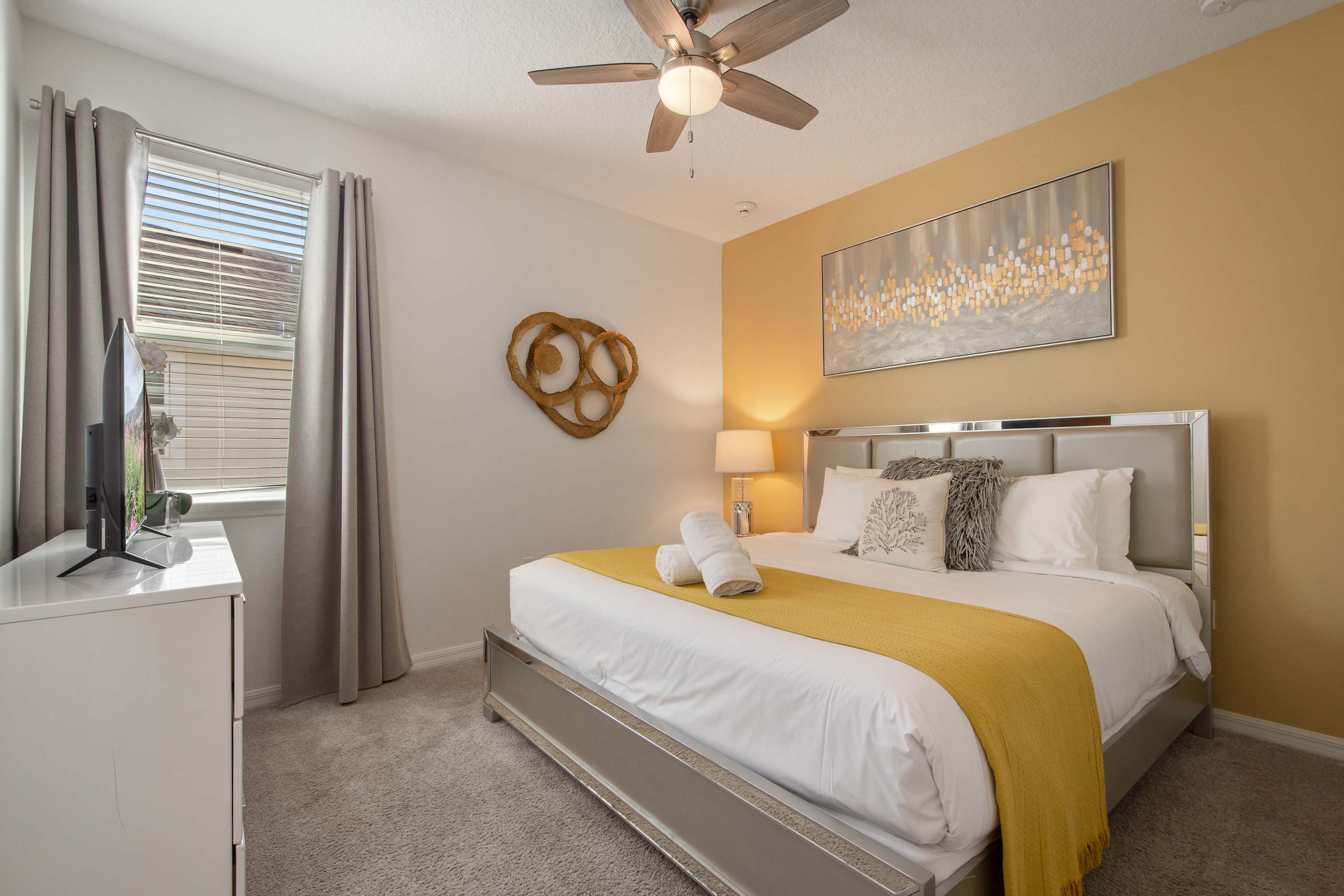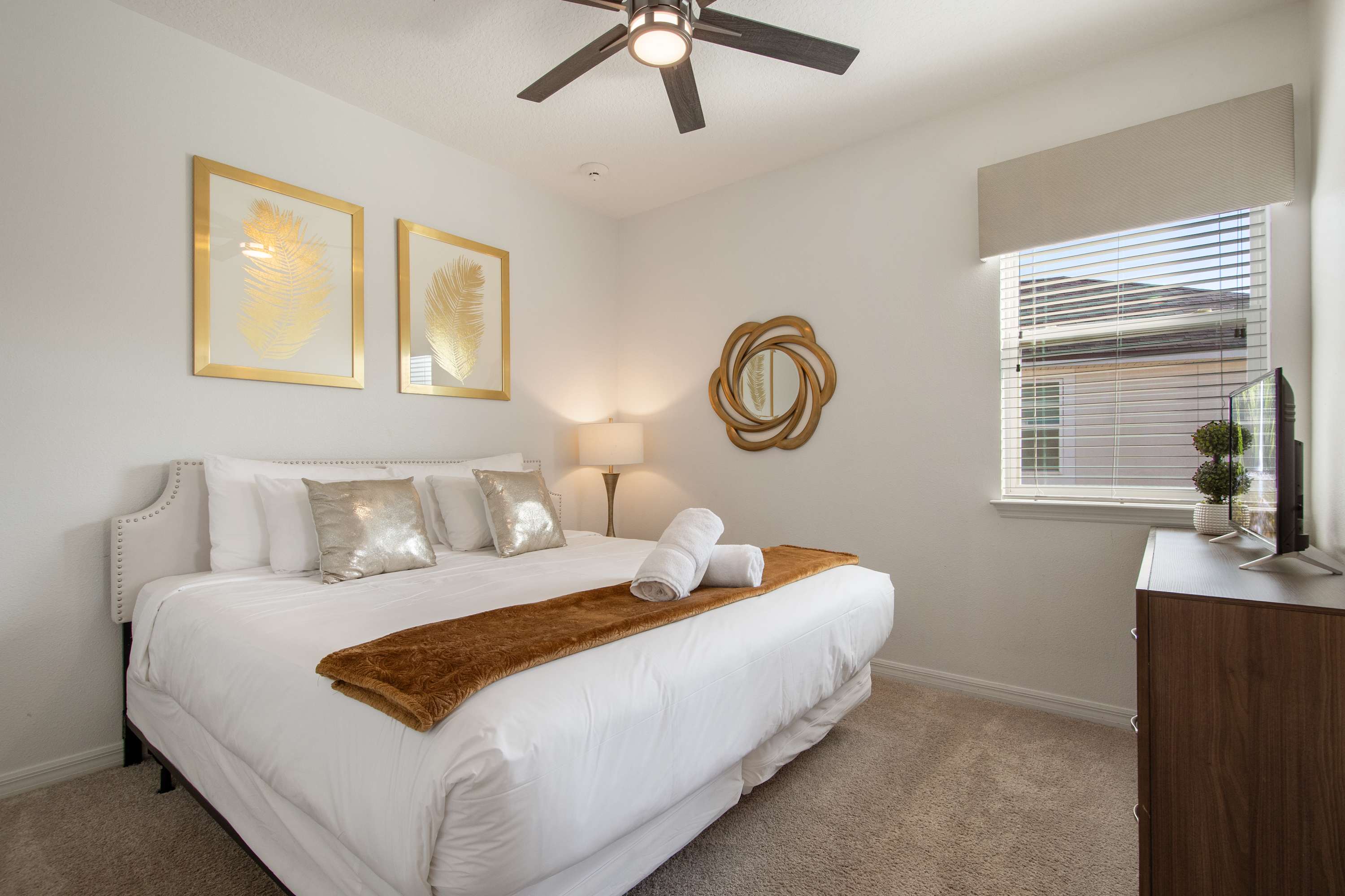 Warm décor, king bed, dresser, Smart TV.