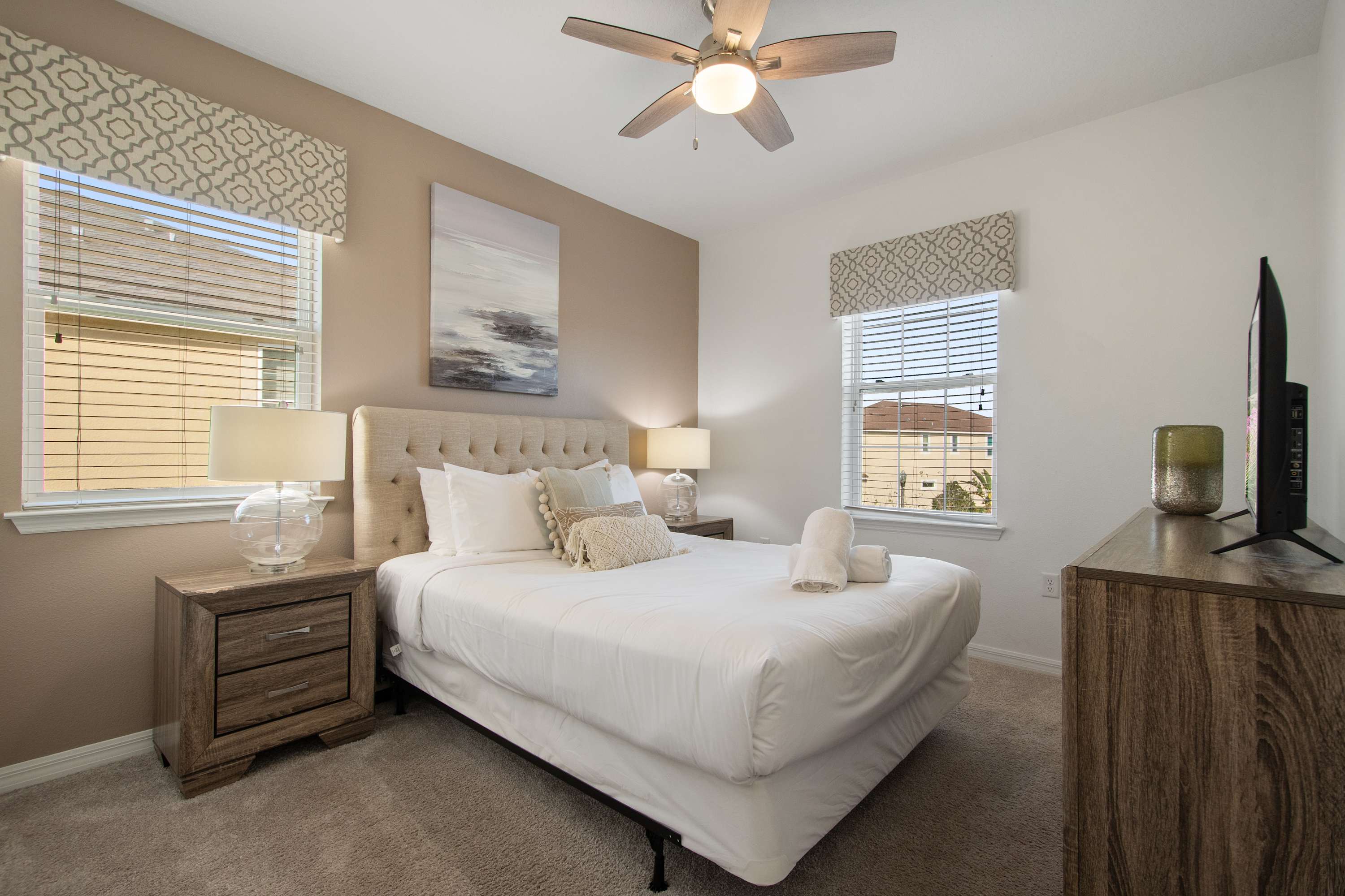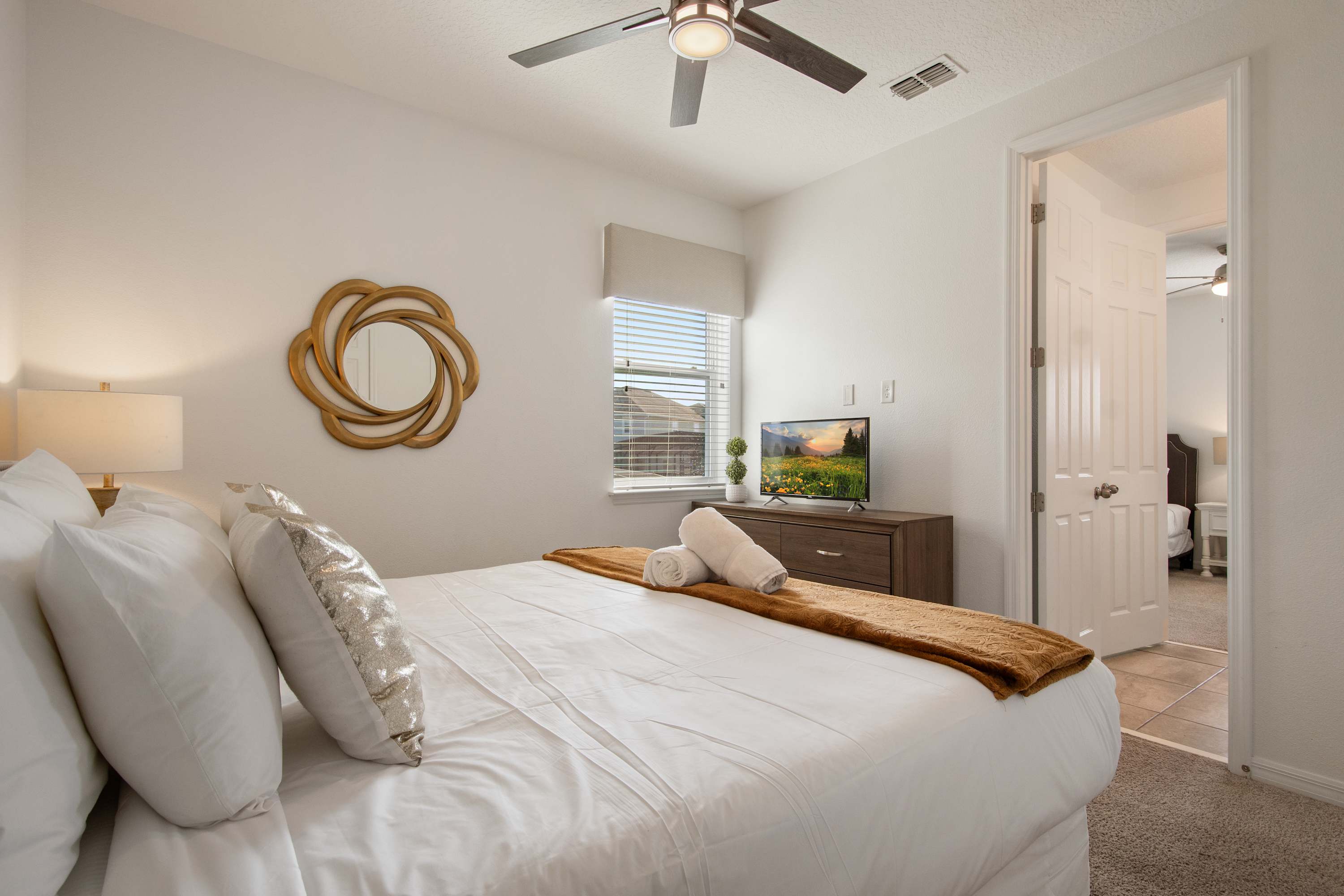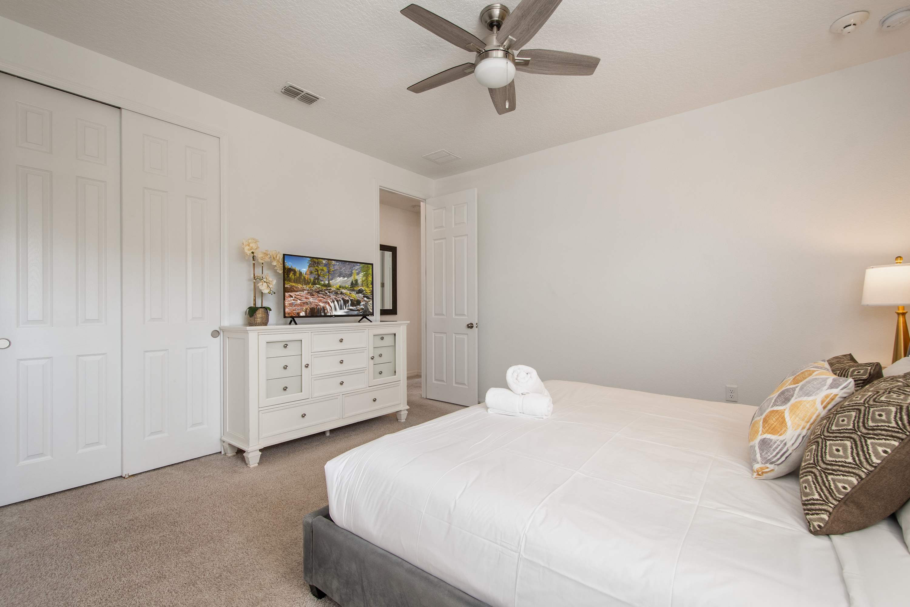 Warm décor, king bed, dresser, Smart TV.