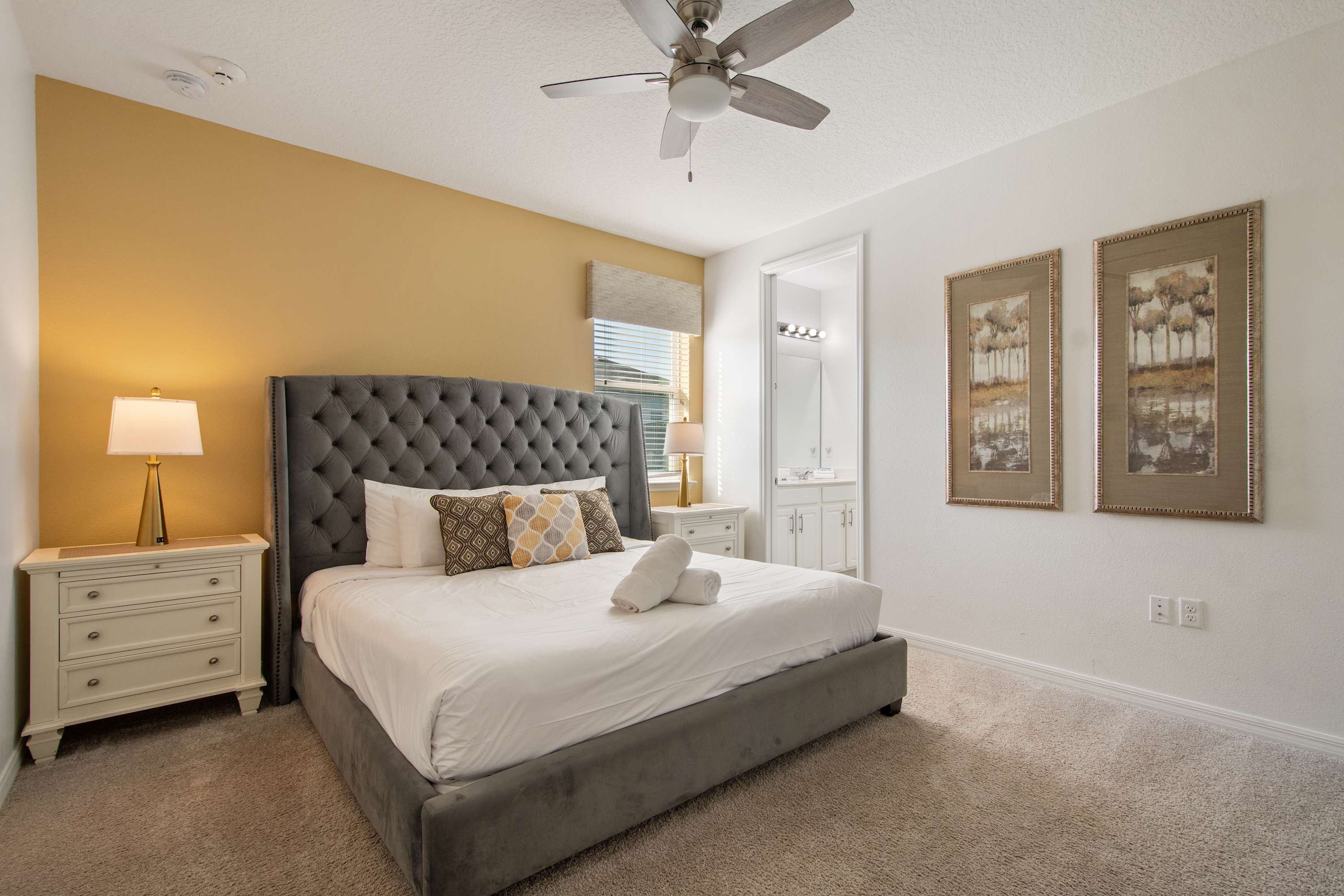 Bright and modern king bedroom with private bath access.