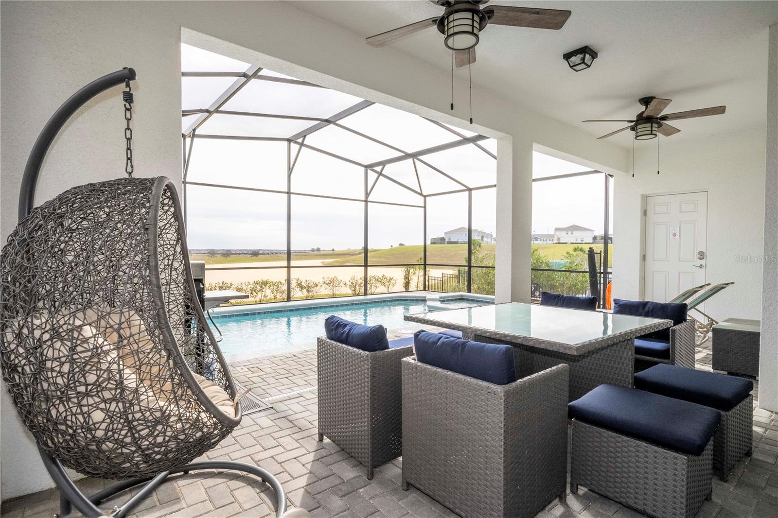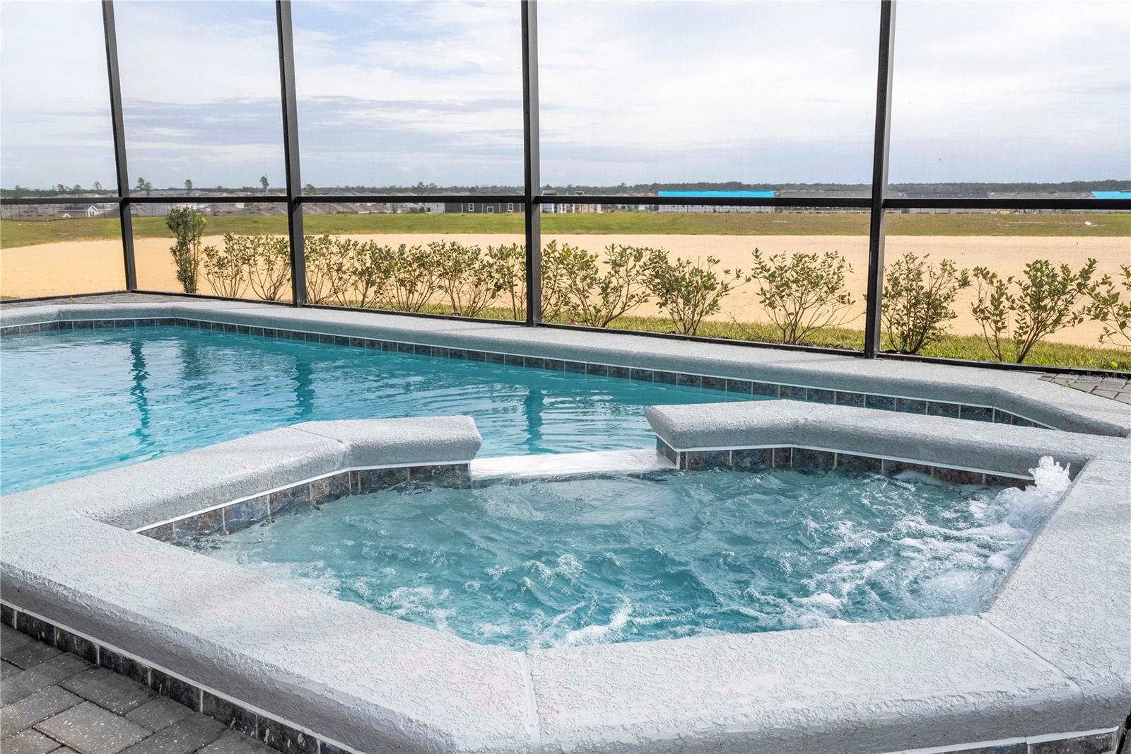 Sliding glass doors lead directly to your private pool and spa, creating a relaxing outdoor space to swim, lounge, or enjoy the Florida sunshine. The backyard backs onto elevated land with no rear neighbors, offering extra privacy behind the home while you relax poolside.