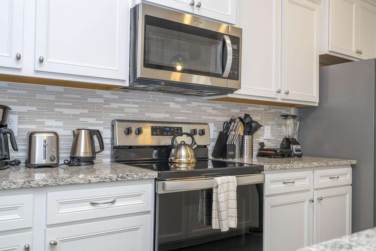 The fully equipped kitchen includes modern appliances, cookware, and everything needed to prepare family meals. A spacious dining table and breakfast bar seating make it easy for everyone to gather for shared meals and conversations.