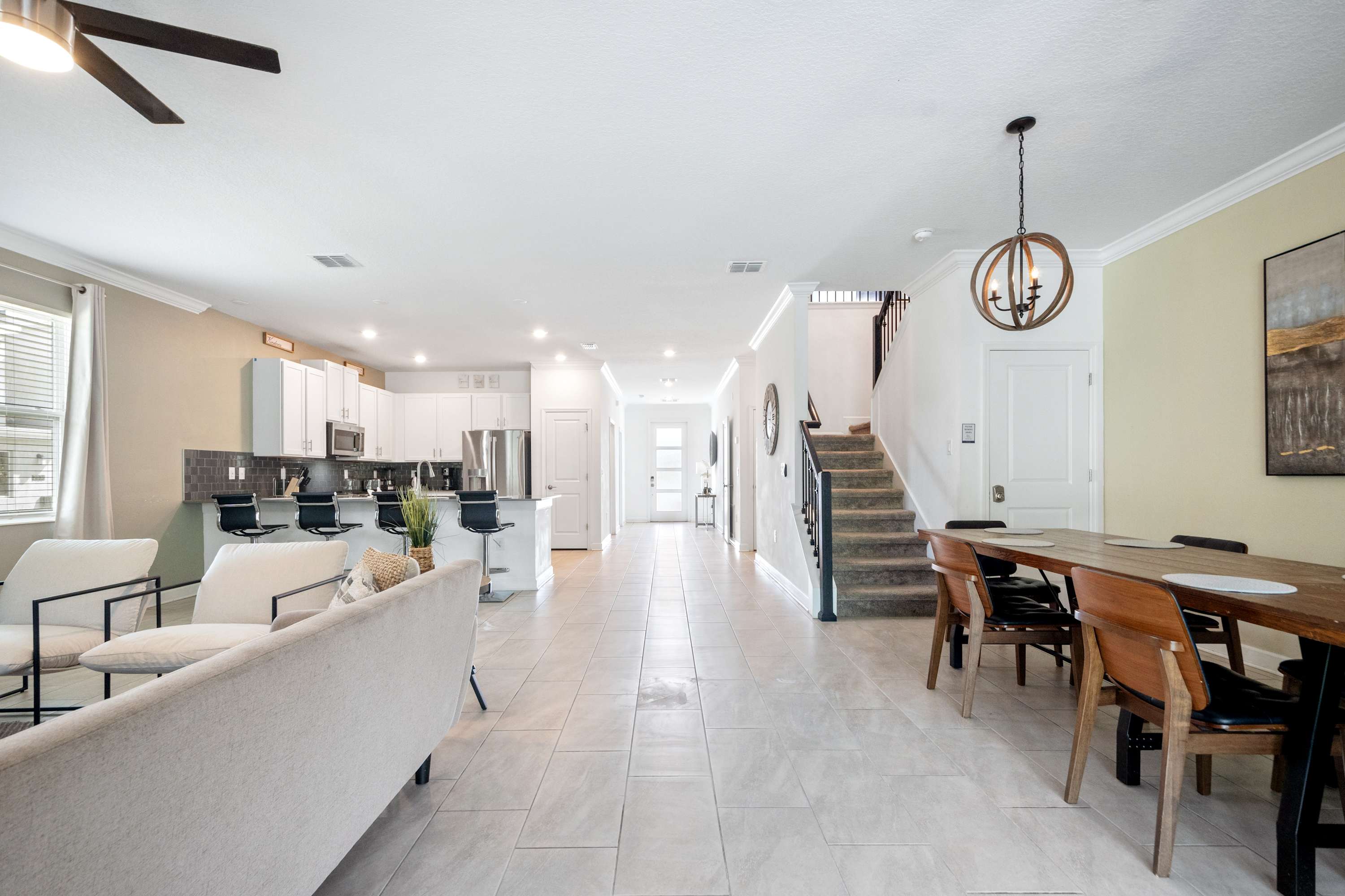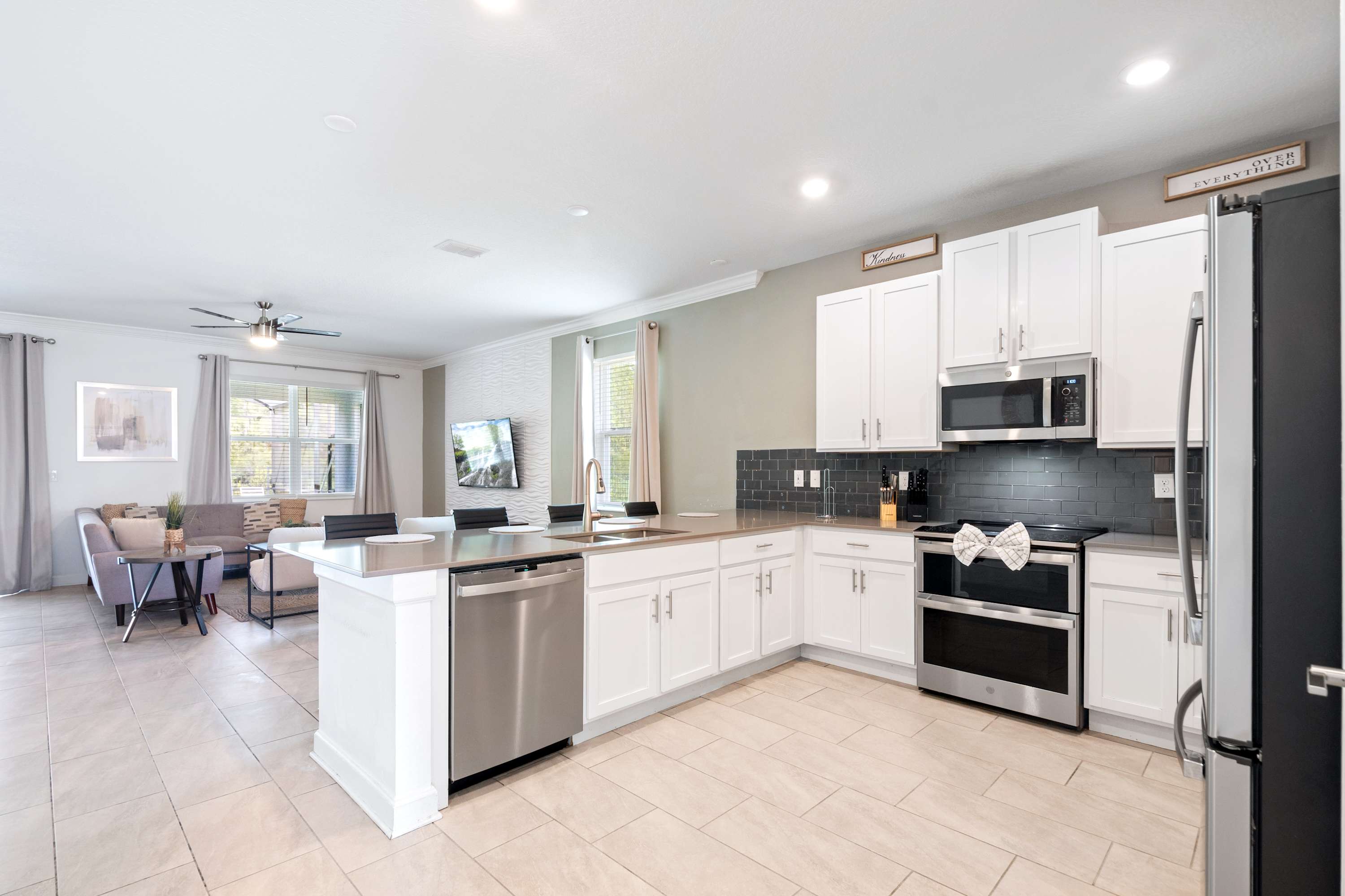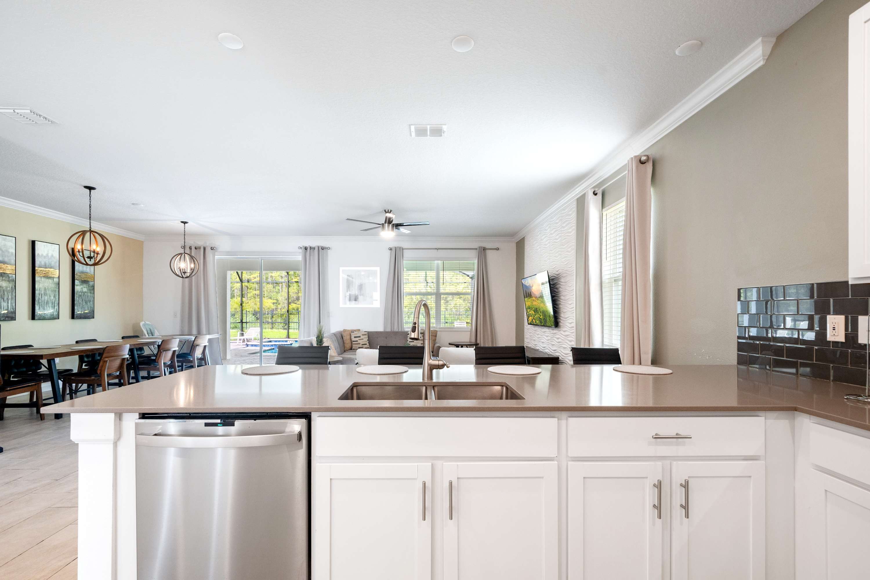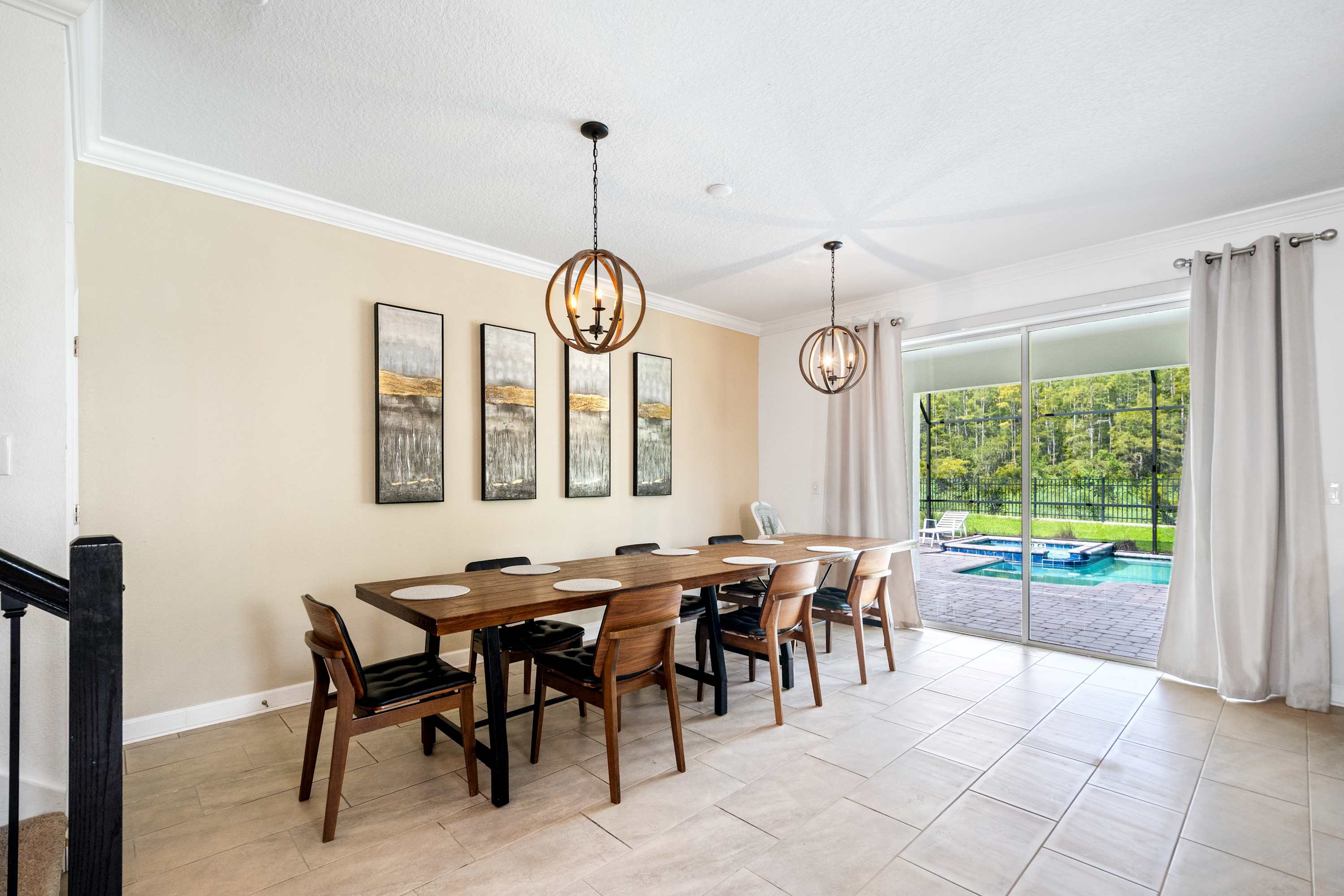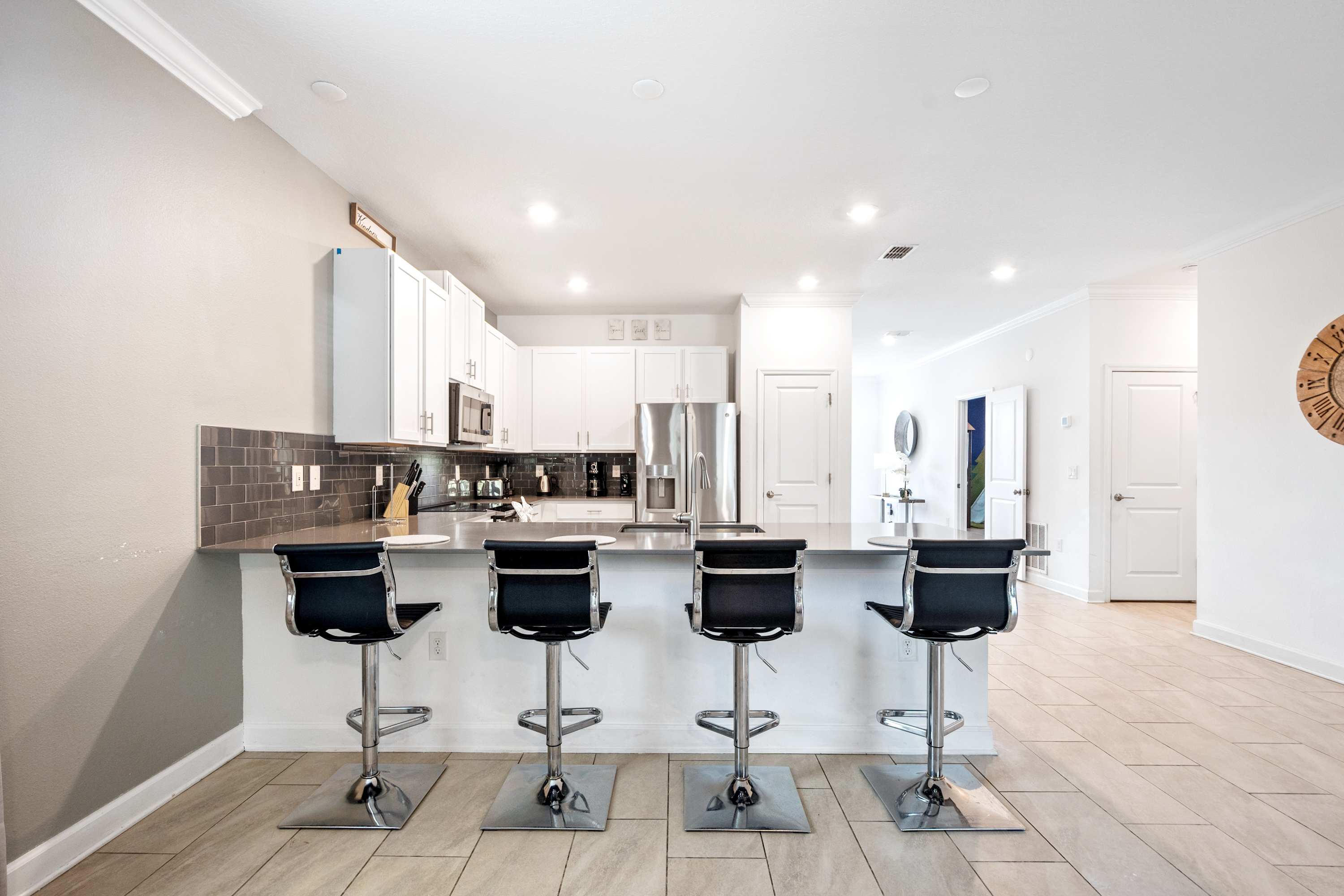 The dining area brings everyone together with a large formal table, complemented by additional bar seating at the kitchen island. Whether you’re hosting a family feast, quick breakfast before the parks, or a late-night snack, there’s plenty of room for everyone to dine comfortably.