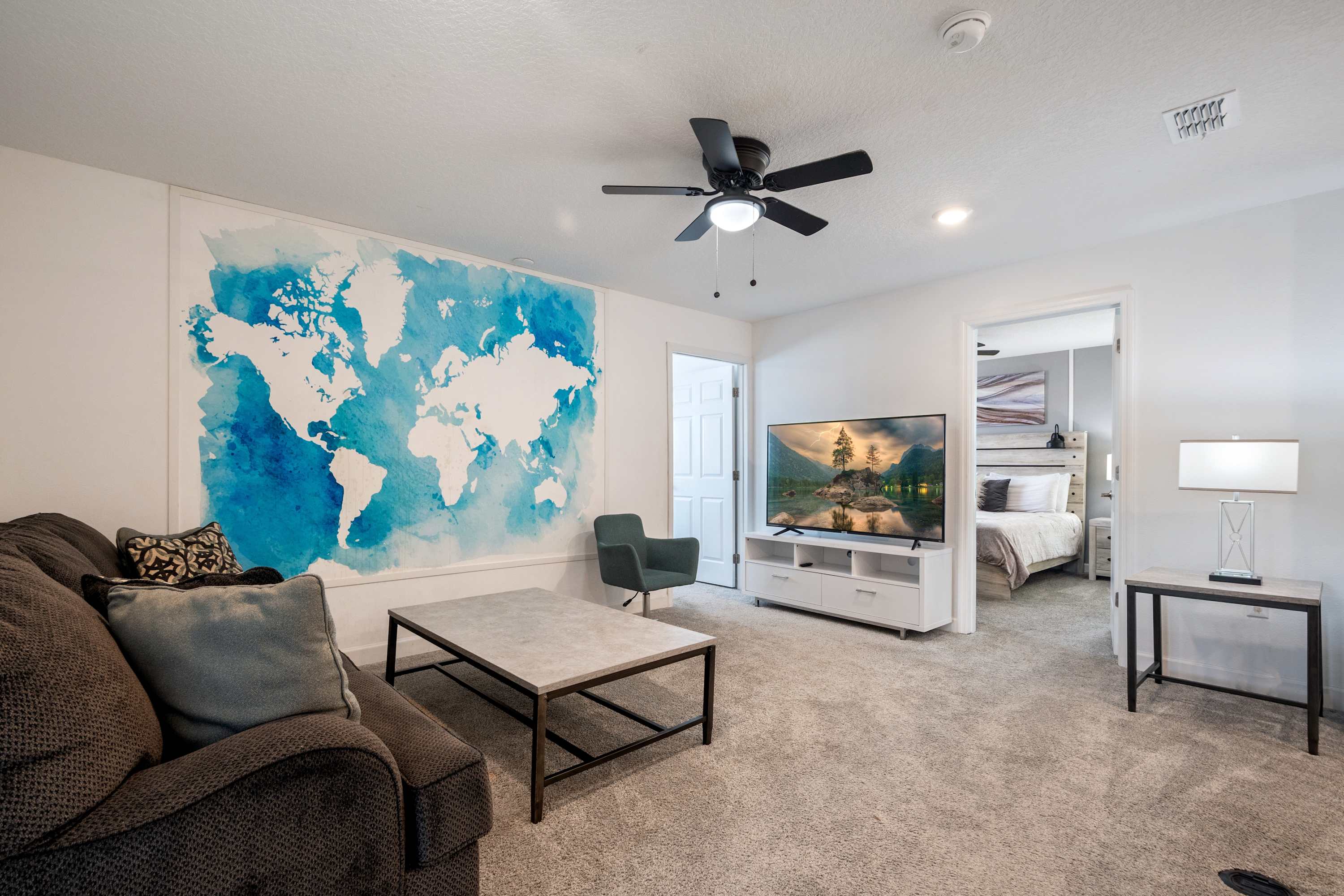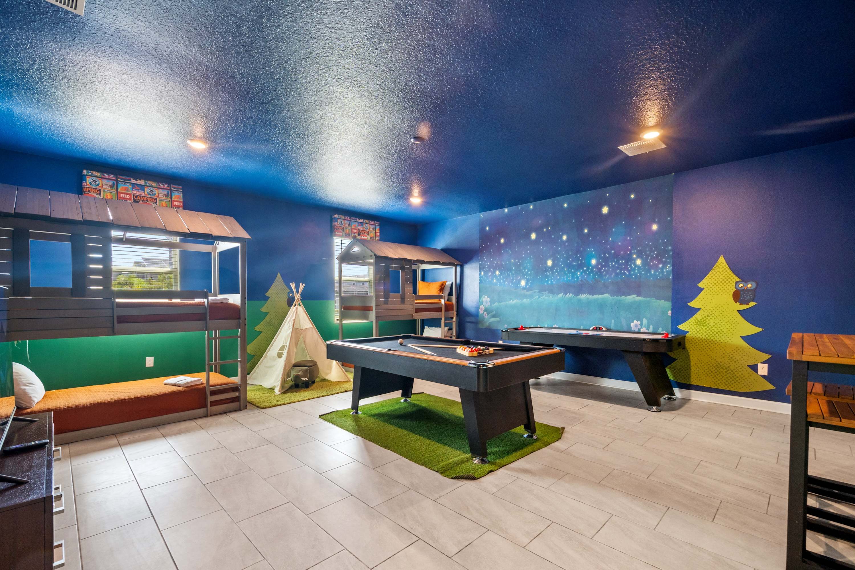 Bring the fun home! The themed game room is a hit with kids and adults alike, featuring air hockey, arcade-style entertainment, and plenty of space for friendly competitions. Bright décor and a playful setup make it a go-to spot for family fun after a day at the parks.