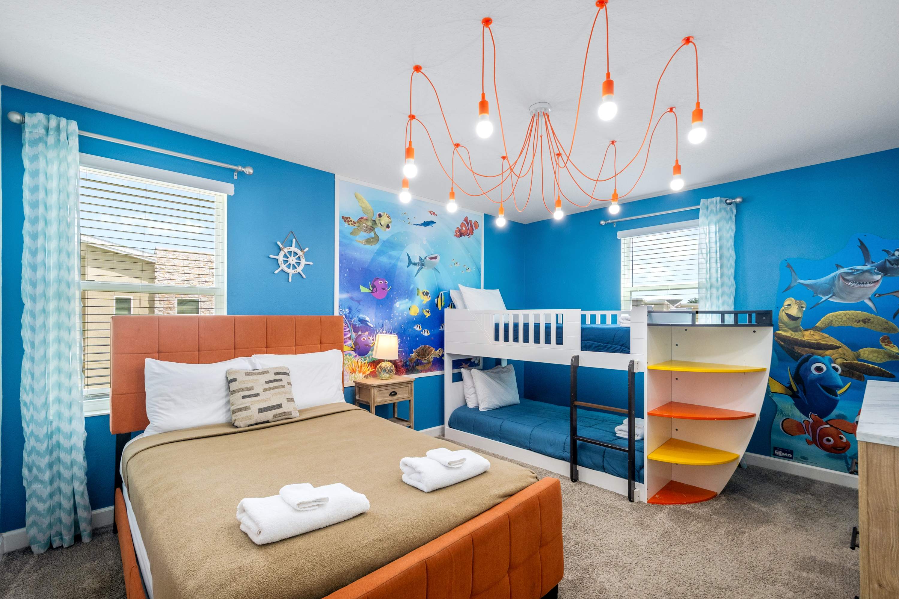 - Bedroom 4 – Nemo Theme (2F): Full + Bunk (twin/Twin), ocean murals
