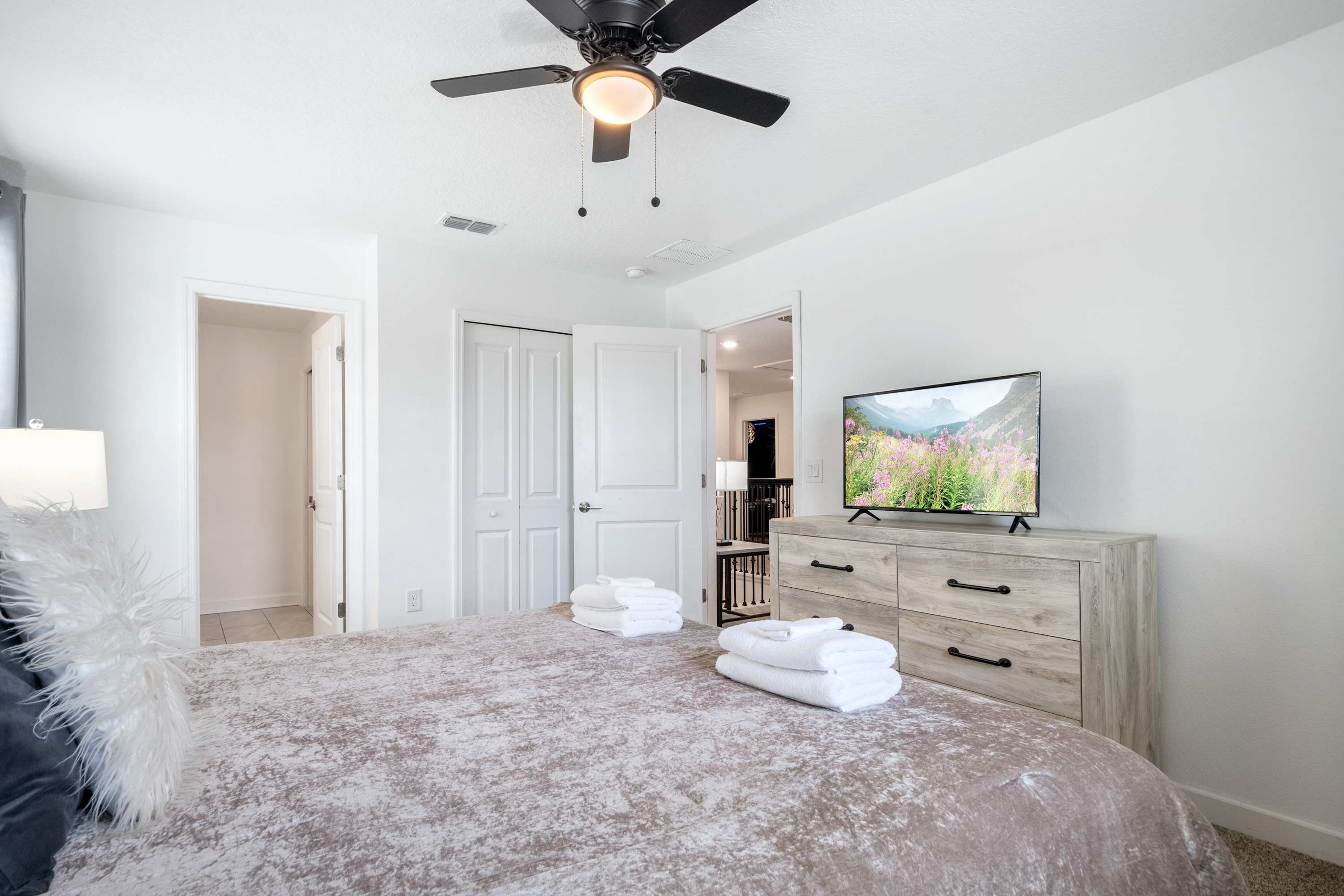 Upstairs, the loft lounge doubles as a second living area, complete with a large smart TV, cozy seating, and space to spread out. It’s the perfect hangout for teens, a quiet reading nook, or a casual movie night while the rest of the group enjoys the main living room downstairs.
