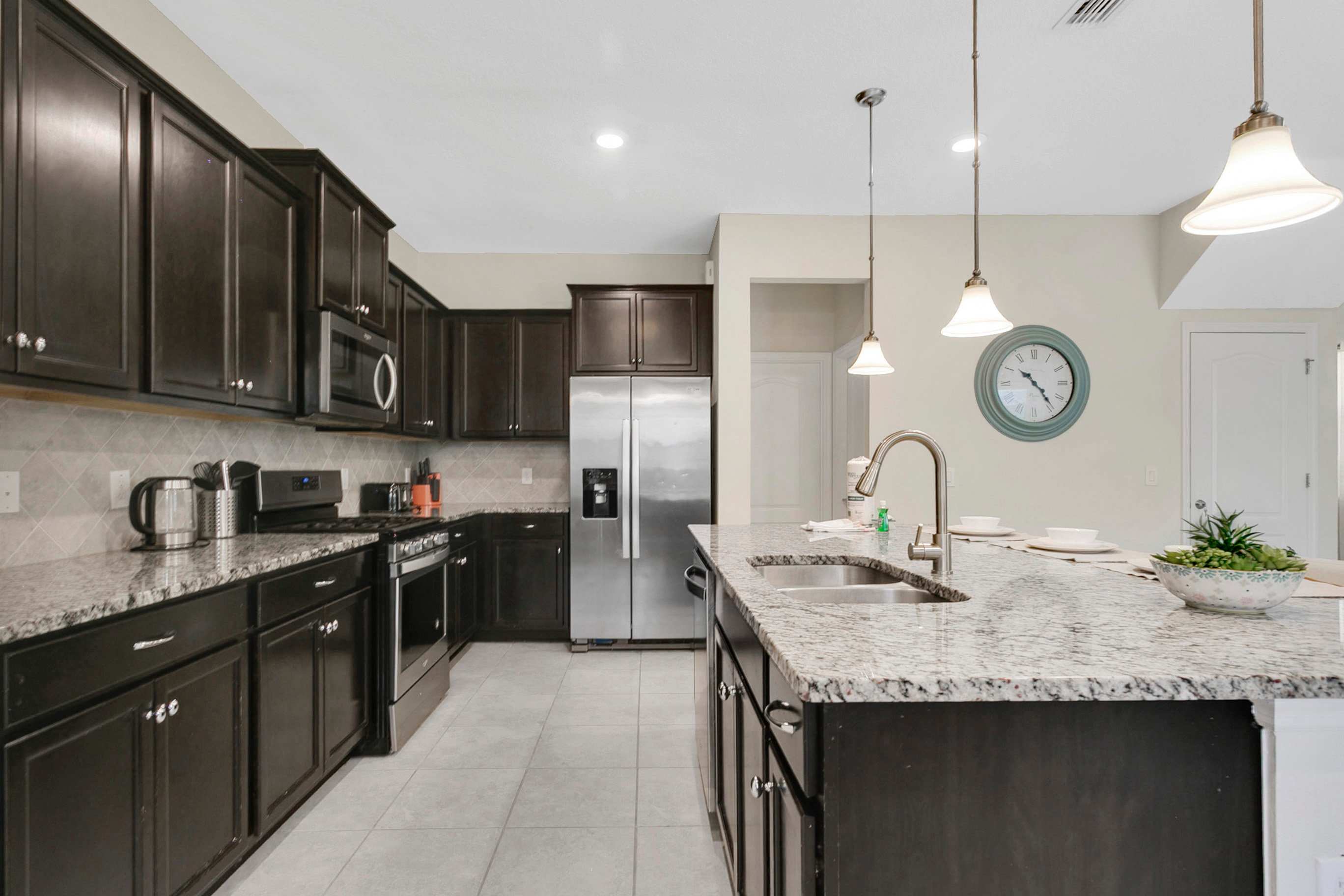 The spacious kitchen is fully equipped with everything you need for both quick breakfasts and full family meals. Enjoy modern cabinetry, ample counter space, island seating, and a bright adjoining dining area.