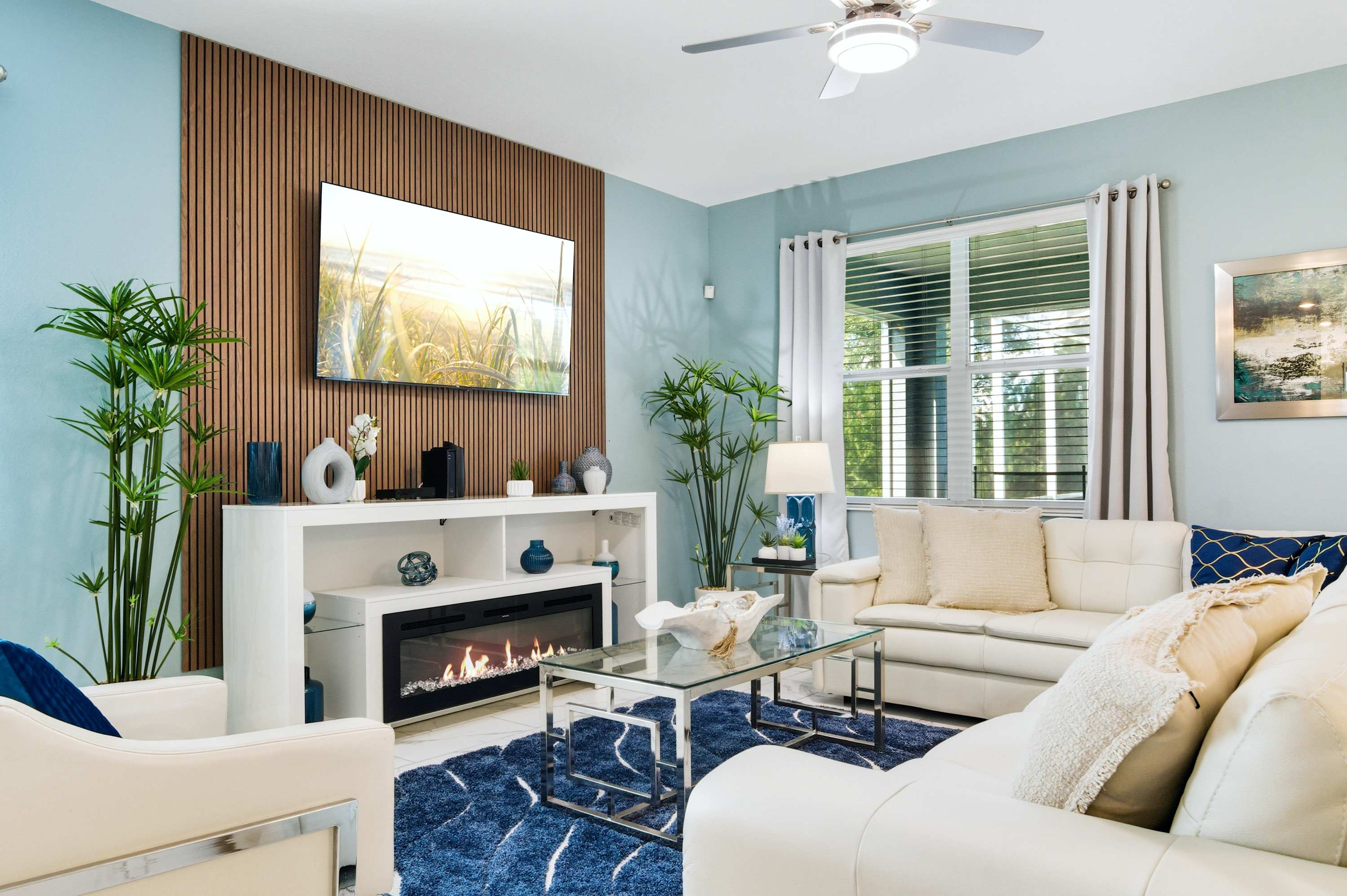 The living room features plush designer seating, a large smart TV for movie nights, and plenty of room to spread out and relax. It’s the perfect space for guests to gather and unwind after a busy day.