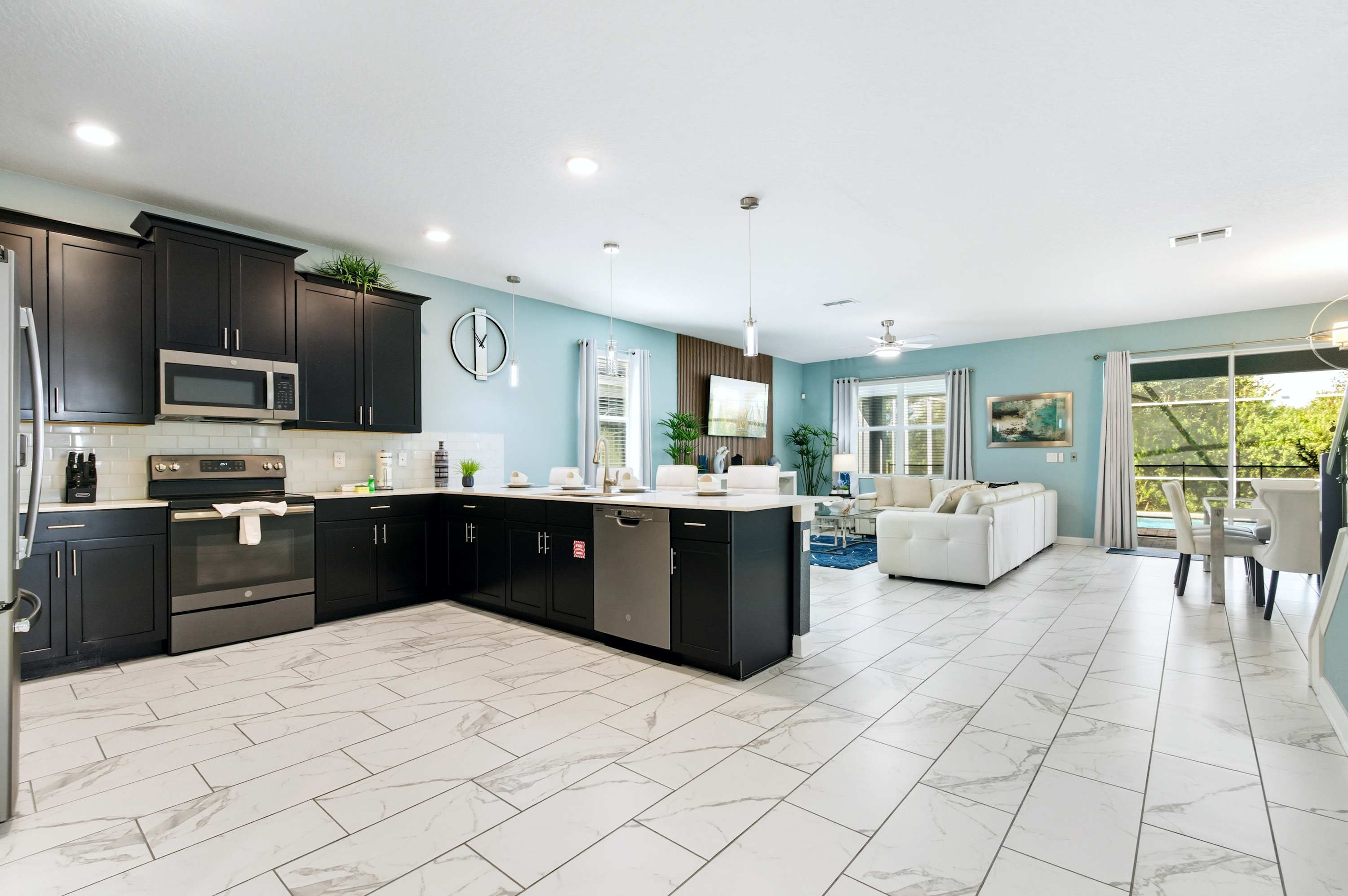 Fully stocked and ready for cooking! The spacious kitchen features high-end stainless steel appliances, a large island with seating, and all the cookware you could need. Whether you're preparing a quick breakfast or a full family dinner, this kitchen has it all.