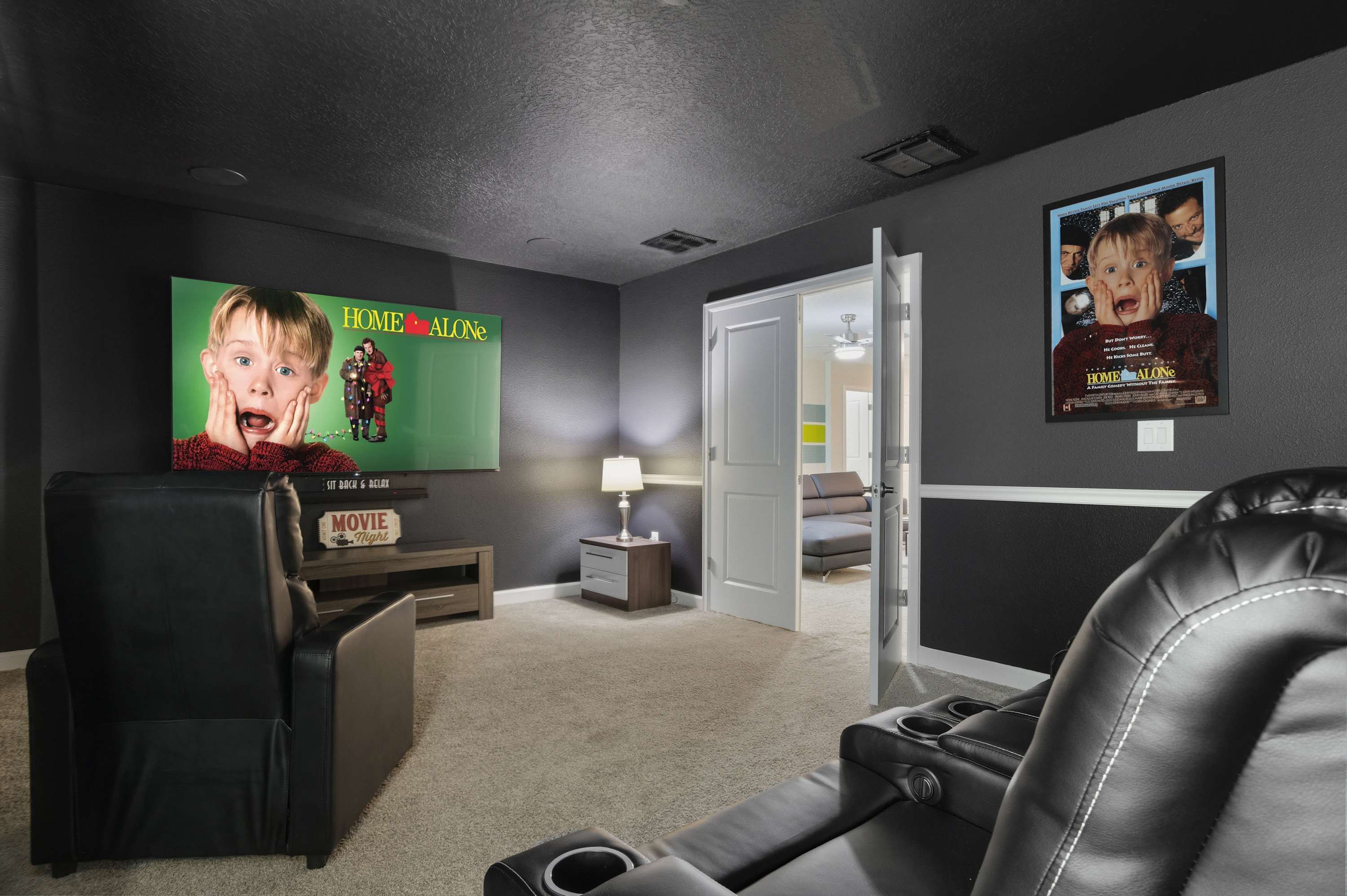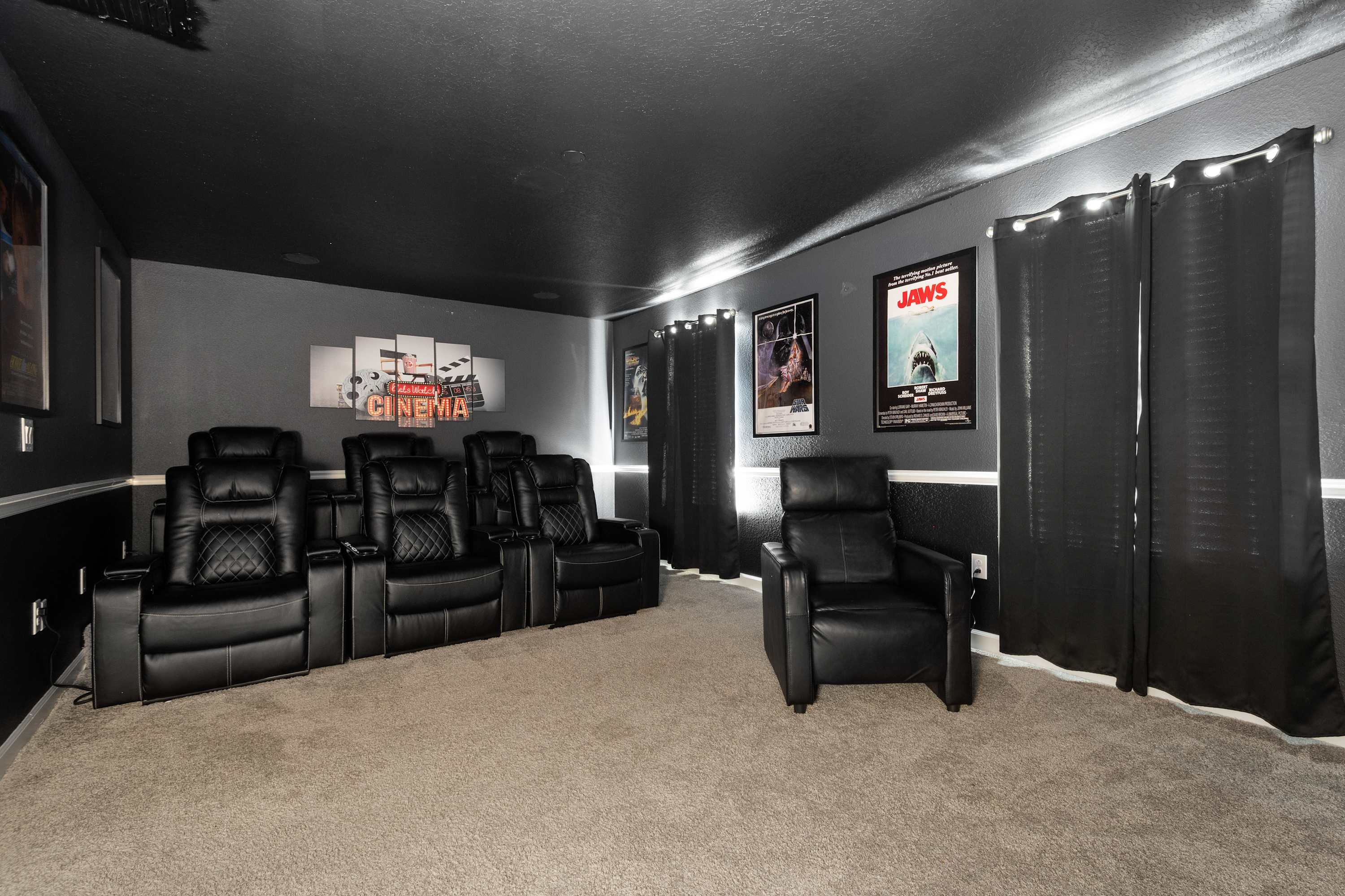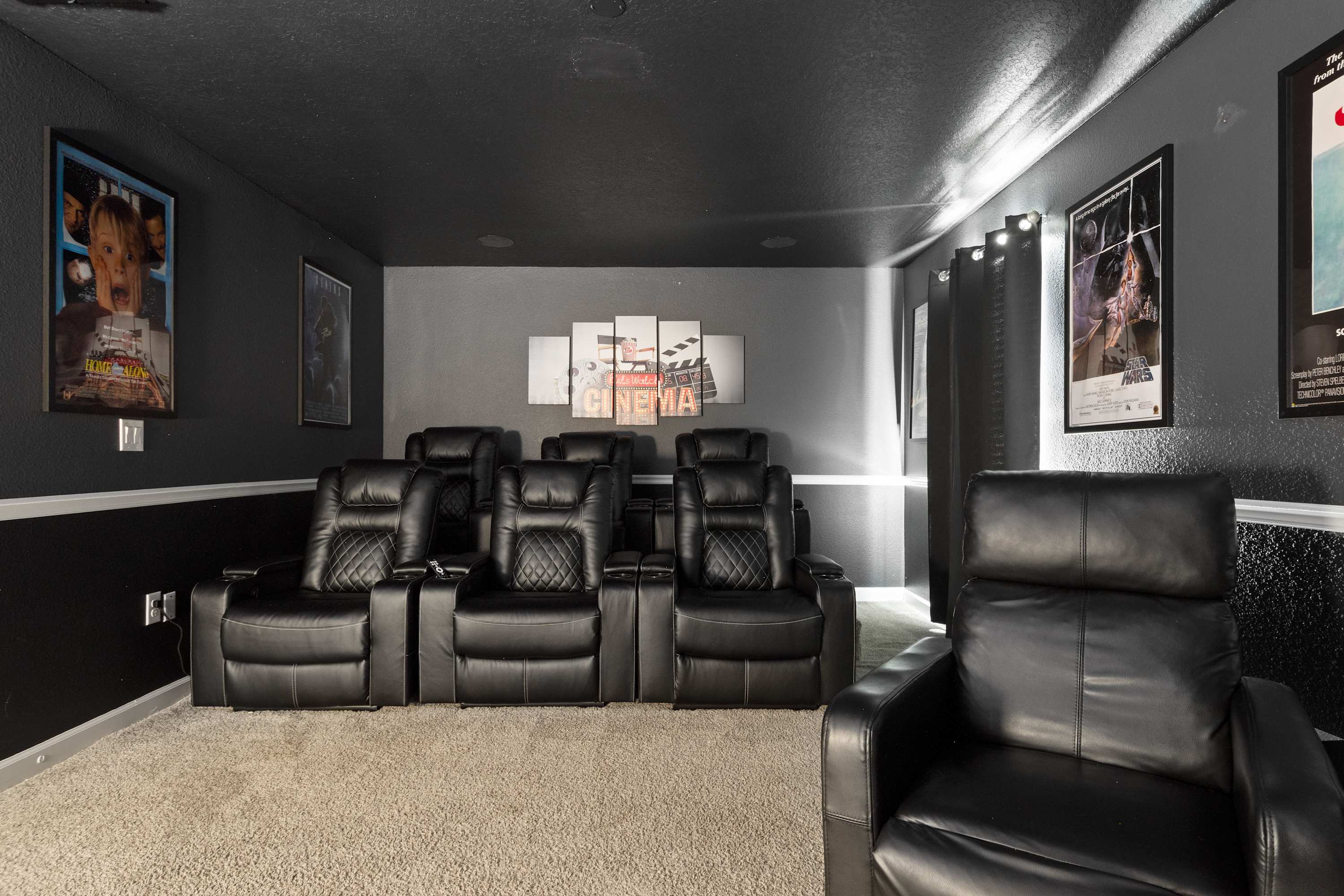 Theatre Room: Home cinema with leather recliners, surround sound, and Star Wars mural (Second Floor)
