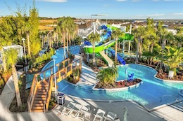 Radiant zero-entry pool with twin water slides, a lazy river, and a kids’ splash pad for aquatic adventures.